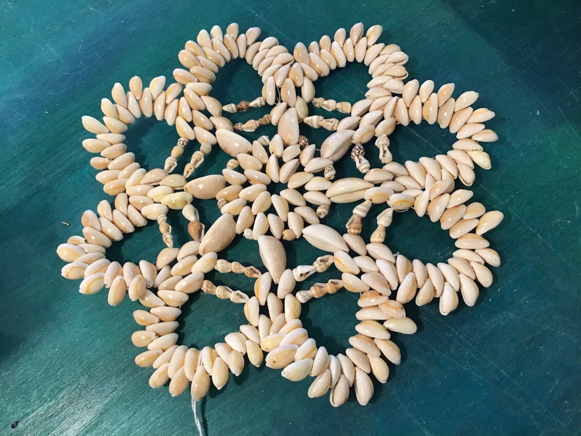 This is a cowry shell trivet that comes in the shape of a flower or a circle. These can be used as placemats in the kitchen or around the home or office as decor. They measure approximately 8-10 in size.