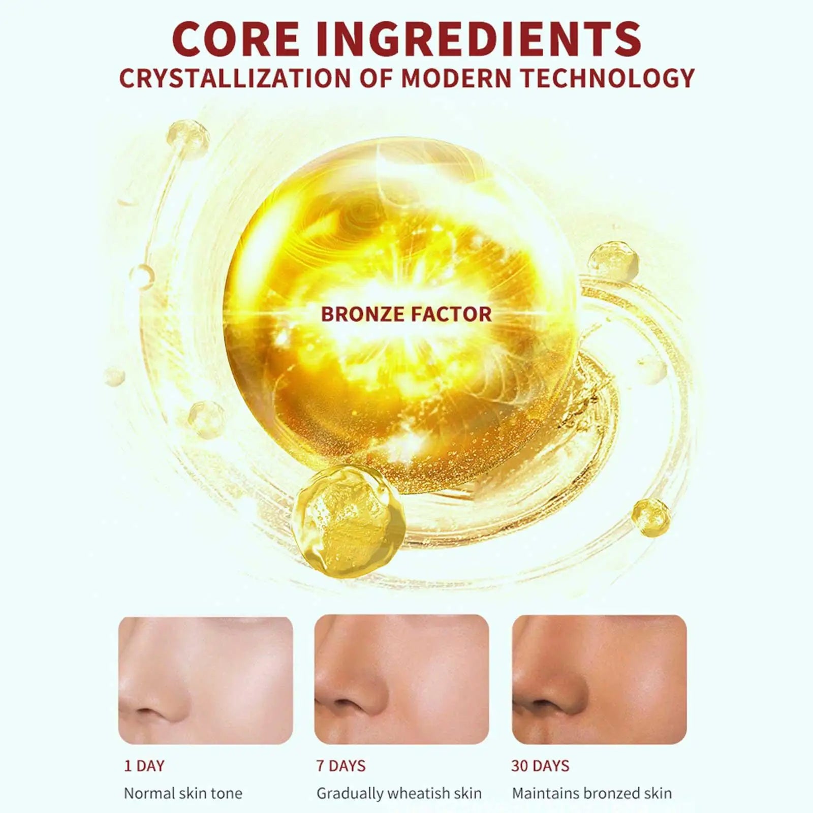 INGREDIENTS: Flaxseed Oil, Coconut Oil, Almond Oil, Grapeseed Oil, Bioactive Bronzer Factors, Vitamin Lecithin Effects Innovative sunless tanning formula designed for people with long-term tanned complexion based on skin characteristics and maintenance needs.