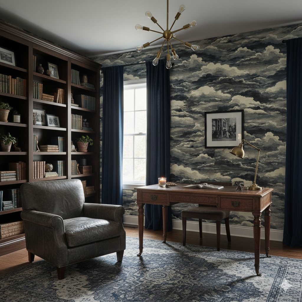 Moody layers of watercolor clouds drift across the canvas in gradients of charcoal, slate, and pale ivory. There’s movement and drama here, yet the palette keeps it sophisticated rather than overwhelming. It evokes both stormy skies and quiet overcast mornings, making it a versatile choice for creating atmosphere. In a living room, it adds gravitas; in a bedroom, it brings depth and intimacy. The monochromatic scheme pairs easily with both minimalist interiors and eclectic mixes of texture.