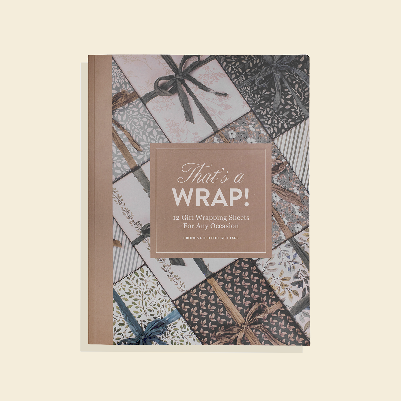 12 sturdy wrapping paper sheets and gold foil enhanced gift tags featuring elegant, hand-drawn illustrations—all conveniently bound together in a book.