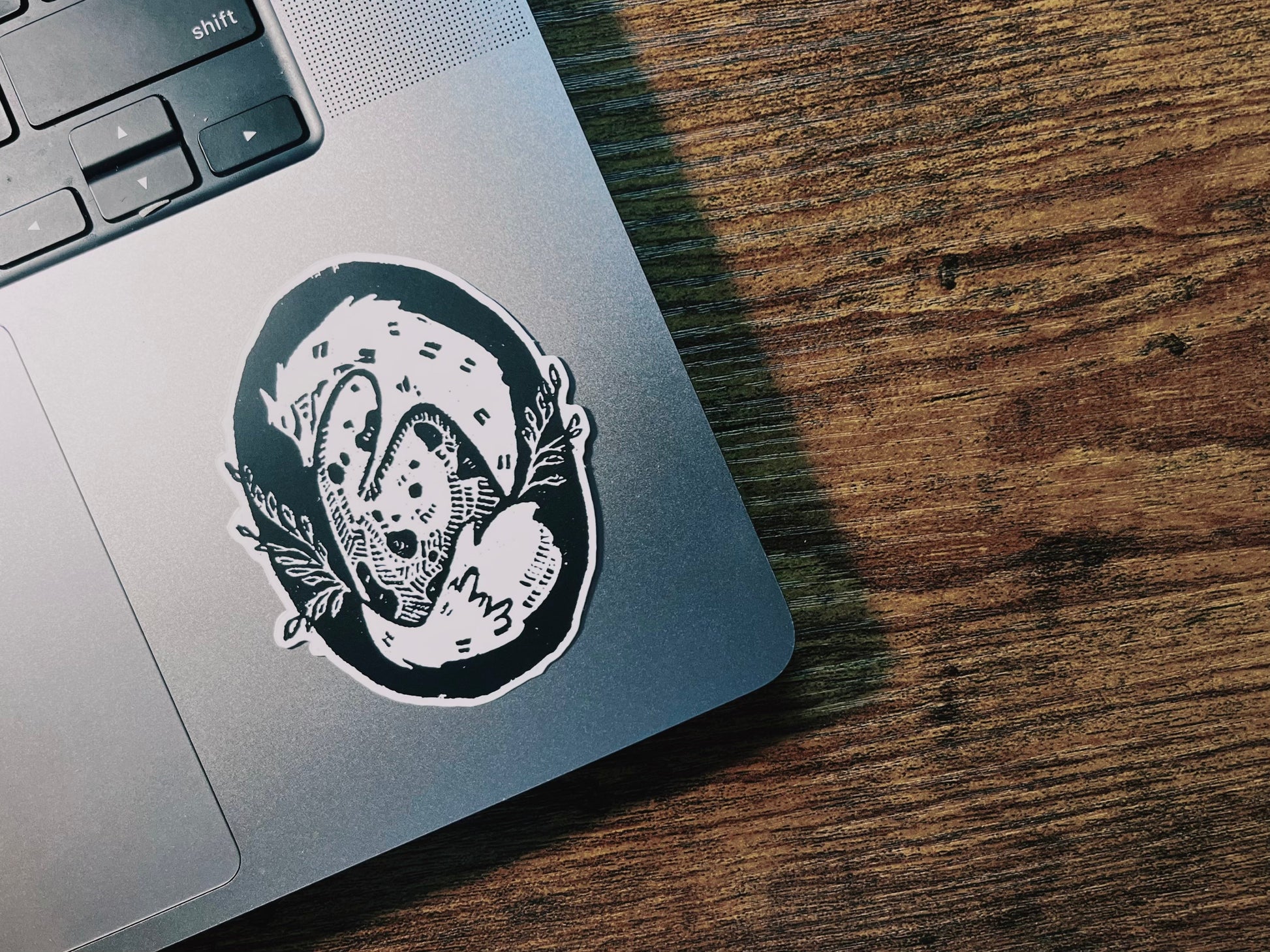 Vinyl stickers are made by using a high-quality scan of the original block-printed design.