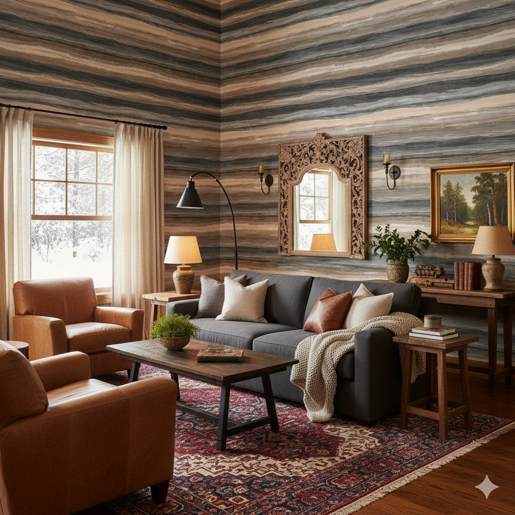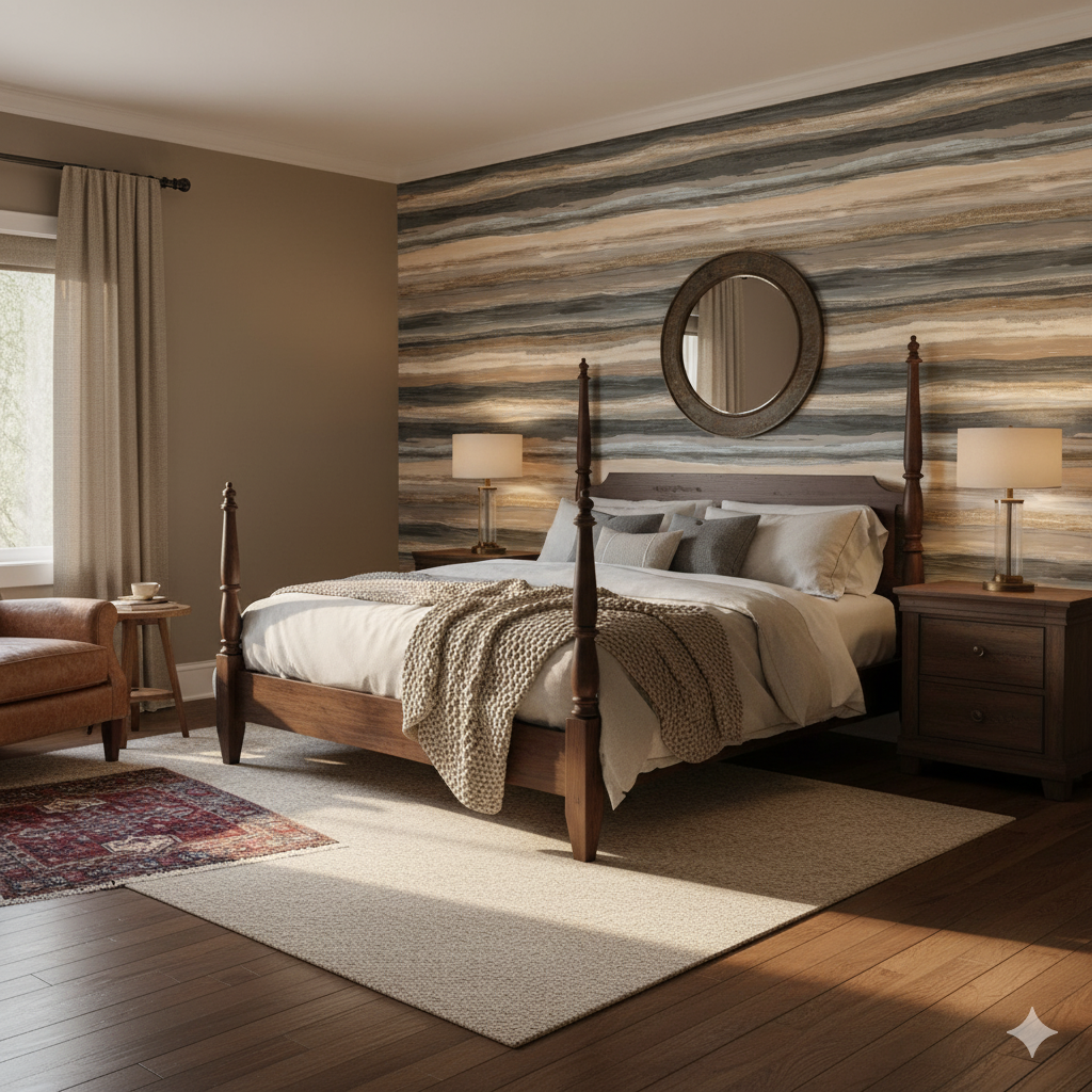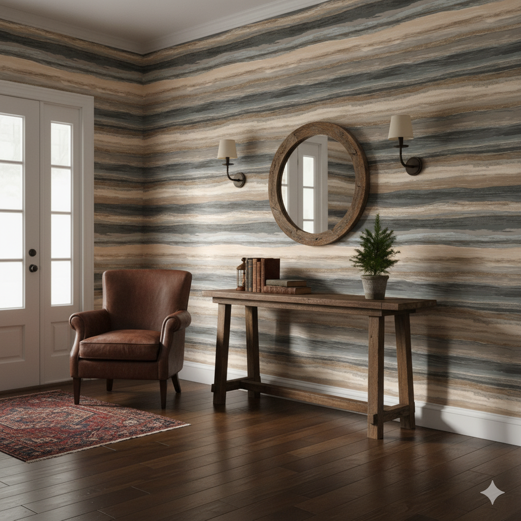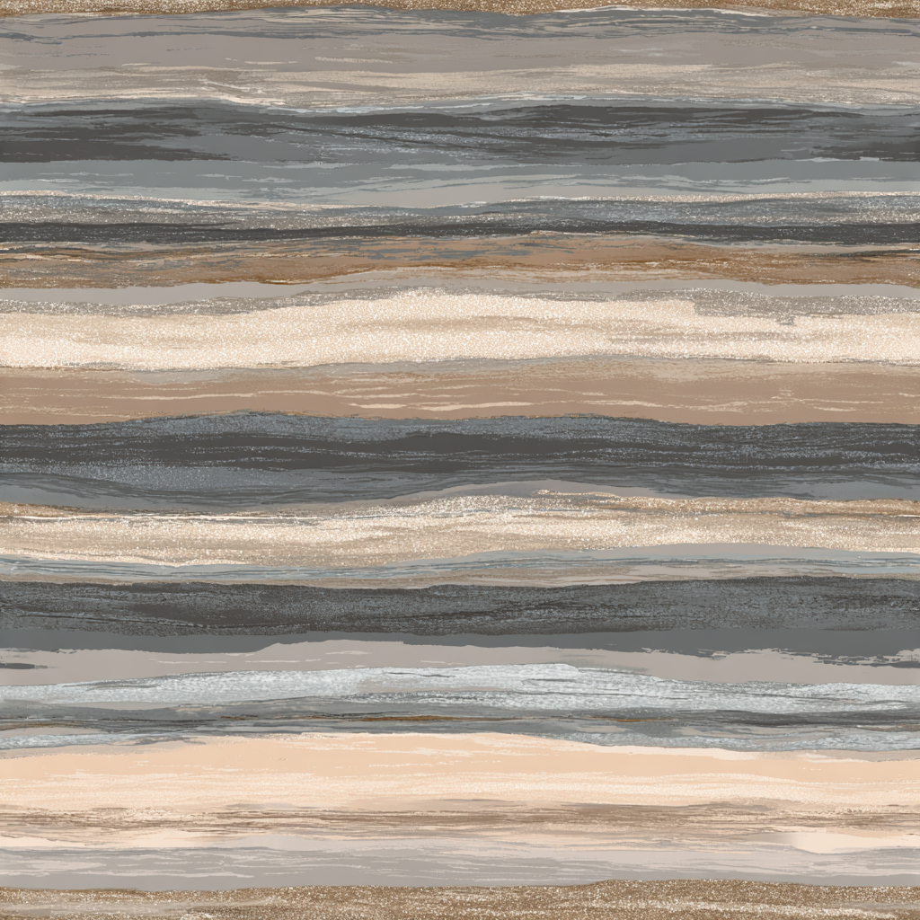 Layered horizontal bands in stormy grays, sandy beiges, and seafoam taupes evoke geological strata and shifting coastlines. Each stripe blends into the next like watercolor washes across paper, giving a sense of continuous ebb and flow. This design works beautifully in coastal-inspired homes, rustic cabins, or even contemporary spaces where texture and movement are desired without overwhelming the eye. The horizontal direction elongates walls, making it an excellent choice for small or narrow rooms where visual expansion is beneficial. It balances raw naturalism with abstract artistry, grounding interiors with organic rhythm.
