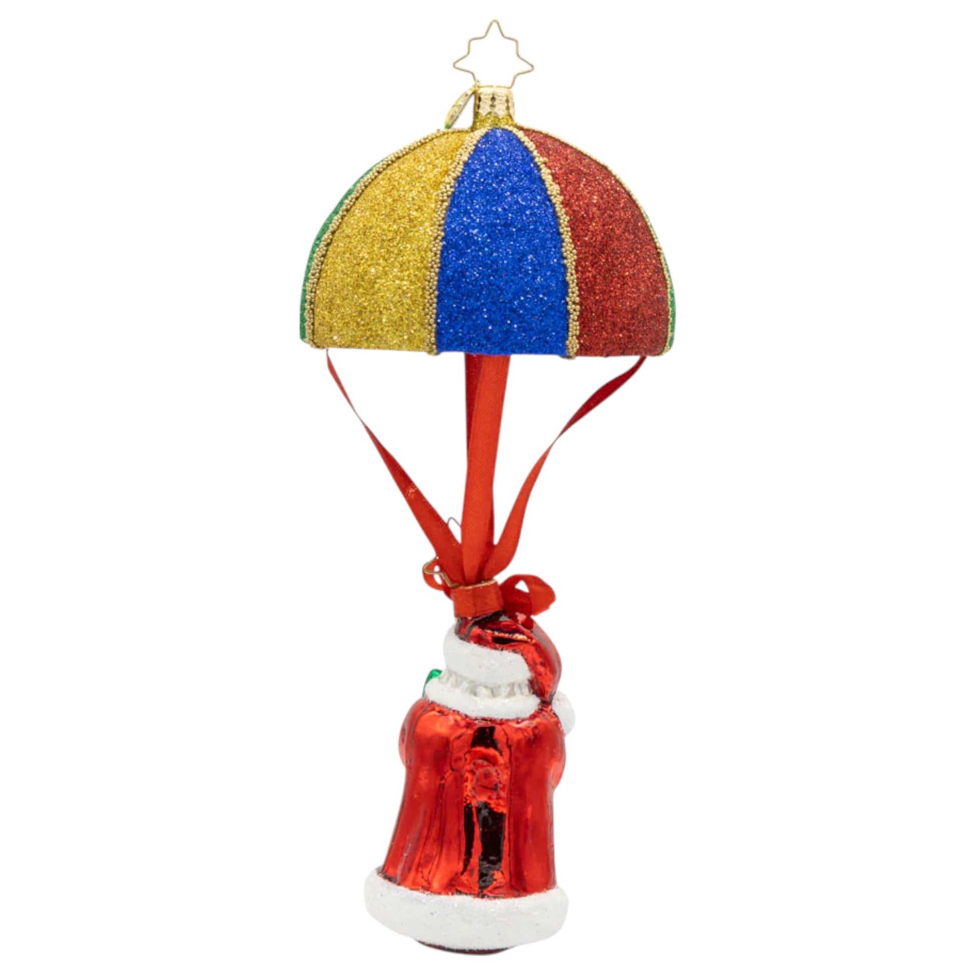 Bring a whimsical dash of fun to your holiday décor with the Tidings from Above Santa ornament! This playful piece features Santa himself, all set for adventure with a brightly colored parachute that bursts with festive cheer. Dressed in his classic red suit and holding a tiny Christmas tree, Santa is ready to deliver joy from the skies, reminding us that the magic of the season knows no bounds. The design draws inspiration from vintage aerial displays, evoking a sense of nostalgia and wonder as we envision Santa soaring through the winter sky on Christmas Eve.