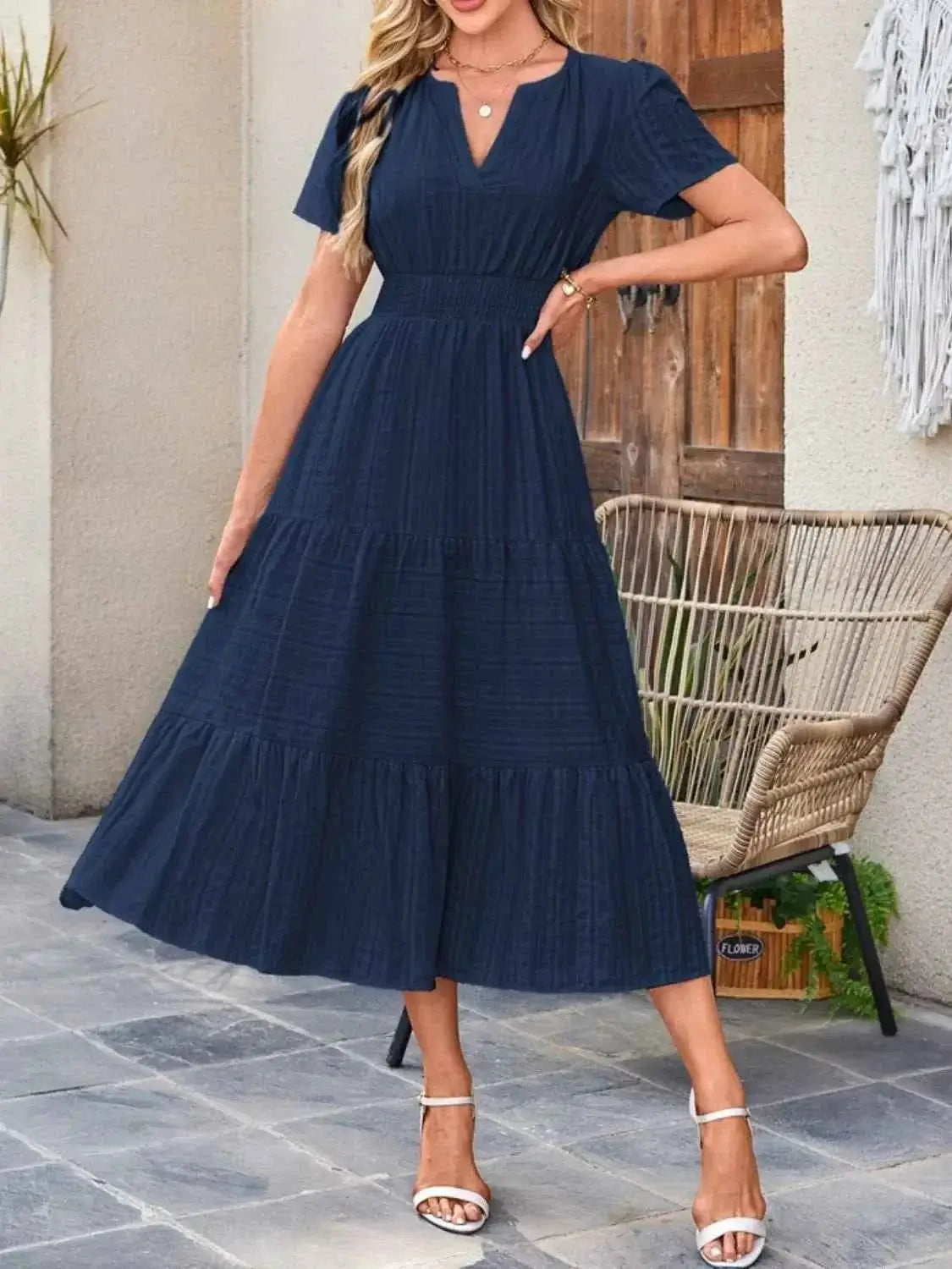 Embrace effortless style and elevate your wardrobe with the Tiered Notched Short Sleeve Dress. Whether paired with heels for a night out or sandals for a casual brunch, this dress promises to be a go-to favorite. Don't miss out on this must-have piece—add it to your cart today!