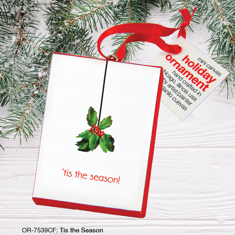 Tis the Season, Ornament (OR-7539CF) is made in the USA from oil paintings by artist, Danilo Cuevas. Miniaturized images mounted on a mini canvas. Each arrive with a red ribbon strand for easy hanging and display.