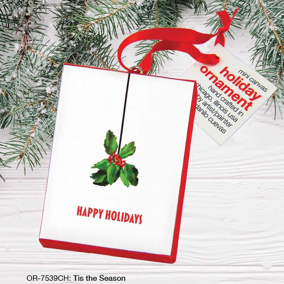 Tis the Season, Ornament (OR-7539CH) is made in the USA from oil paintings by artist, Danilo Cuevas. Miniaturized images mounted on a mini canvas. Each arrive with a red ribbon strand for easy hanging and display.