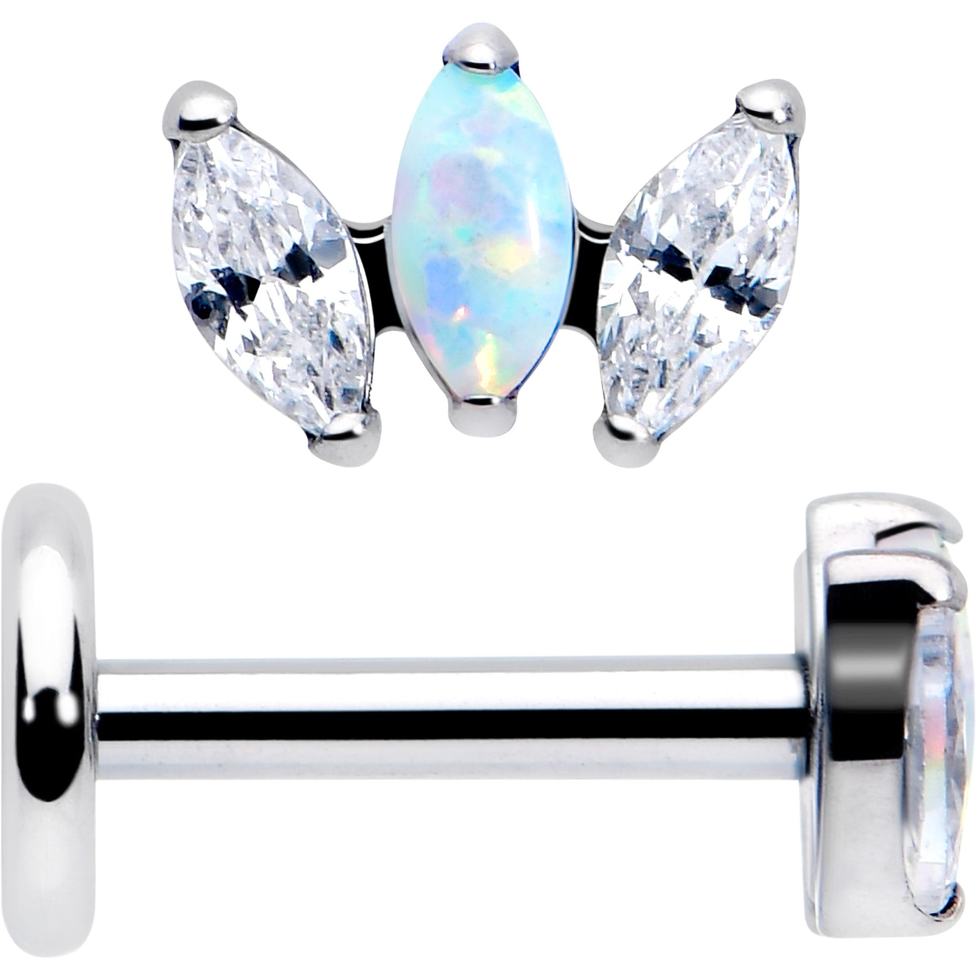 Hypoallergenic Implant Grade Titanium Flat Back Earring. Get triple the style with this 18 gauge lip ring. It's made with a 6mm hypoallergenic ASTM F-136 implant grade titanium straight post with a flat disc end. It features a pair of oval clear gems flanking a matching white synthetic opal. It also features an internally threaded design for maximum comfort on insertion and removal. You can even rock this jewelry in multiple piercings including tragus, helix, ear lobe and some nostril piercings. With such a timeless style and such thoughtful details, this flat back earring is one you'll love three times as much.Specifications