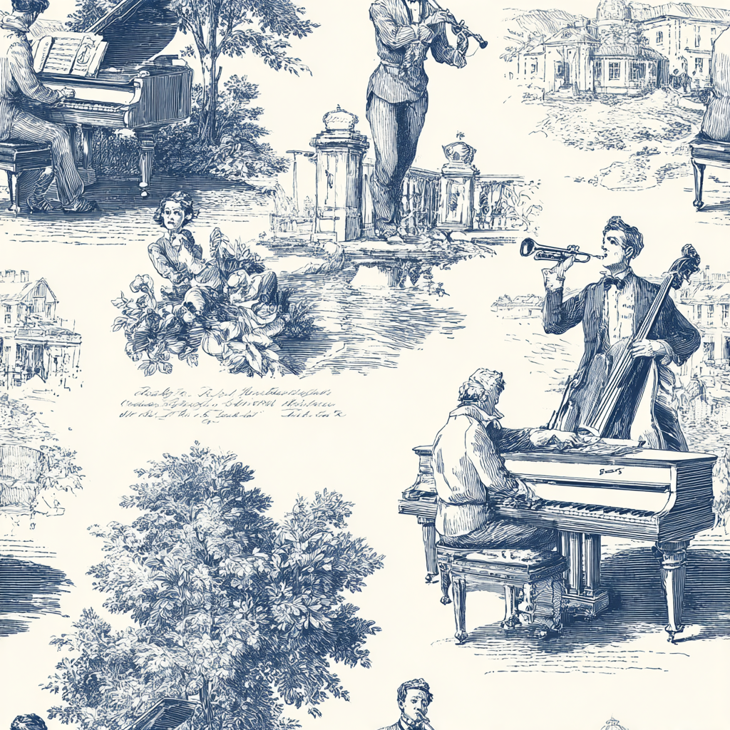 This intricate toile de Jouy tells a classical story through vignettes of musicians, grand pianos, and scenic gardens. Rendered entirely in fine, inky blue linework against a soft ivory ground, the design feels like a page from a forgotten etching or a composer’s sketchbook. Elegant and timeless, perfect for traditional textiles or niche wallpaper for music lovers and romantics alike.