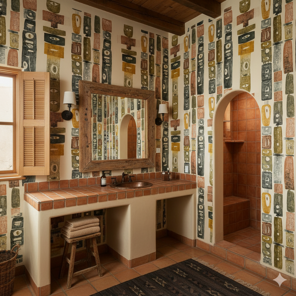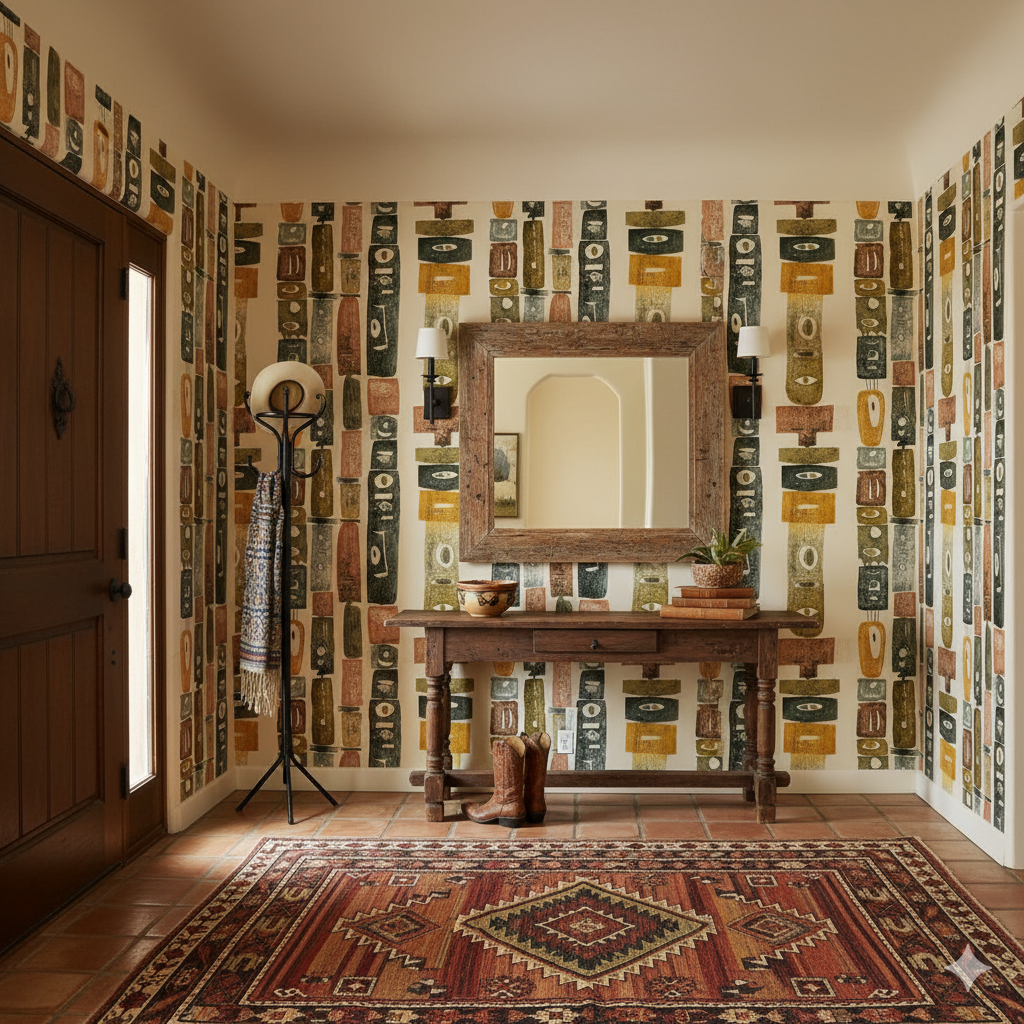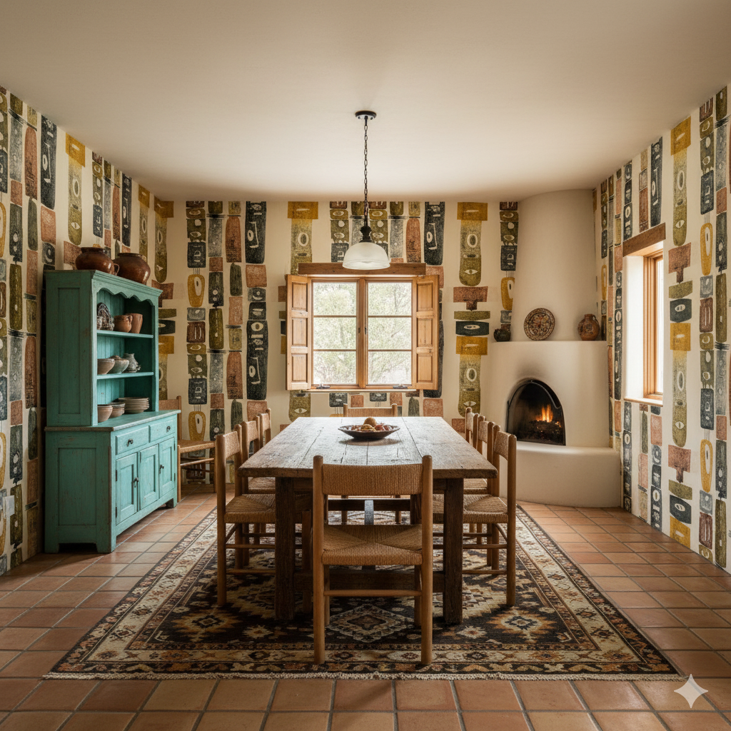 Primitive symbolism takes center stage in this striking composition of stacked vertical motifs. Abstract forms, painted in muted ochres, charcoal black, moss green, and russet, rise like columns carved with watchful eyes and stylized features. Each element suggests ancestral guardianship, evoking tribal sculpture and ritual objects. The raw textures give the pattern depth and authenticity, while the vertical rhythm makes it especially dynamic for tall walls or stairwell backdrops. Perfect for eclectic interiors, creative workspaces, or rustic modern homes, this wallpaper pairs beautifully with natural stone, unfinished woods, and woven textiles.