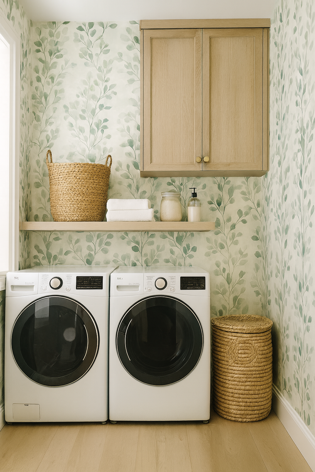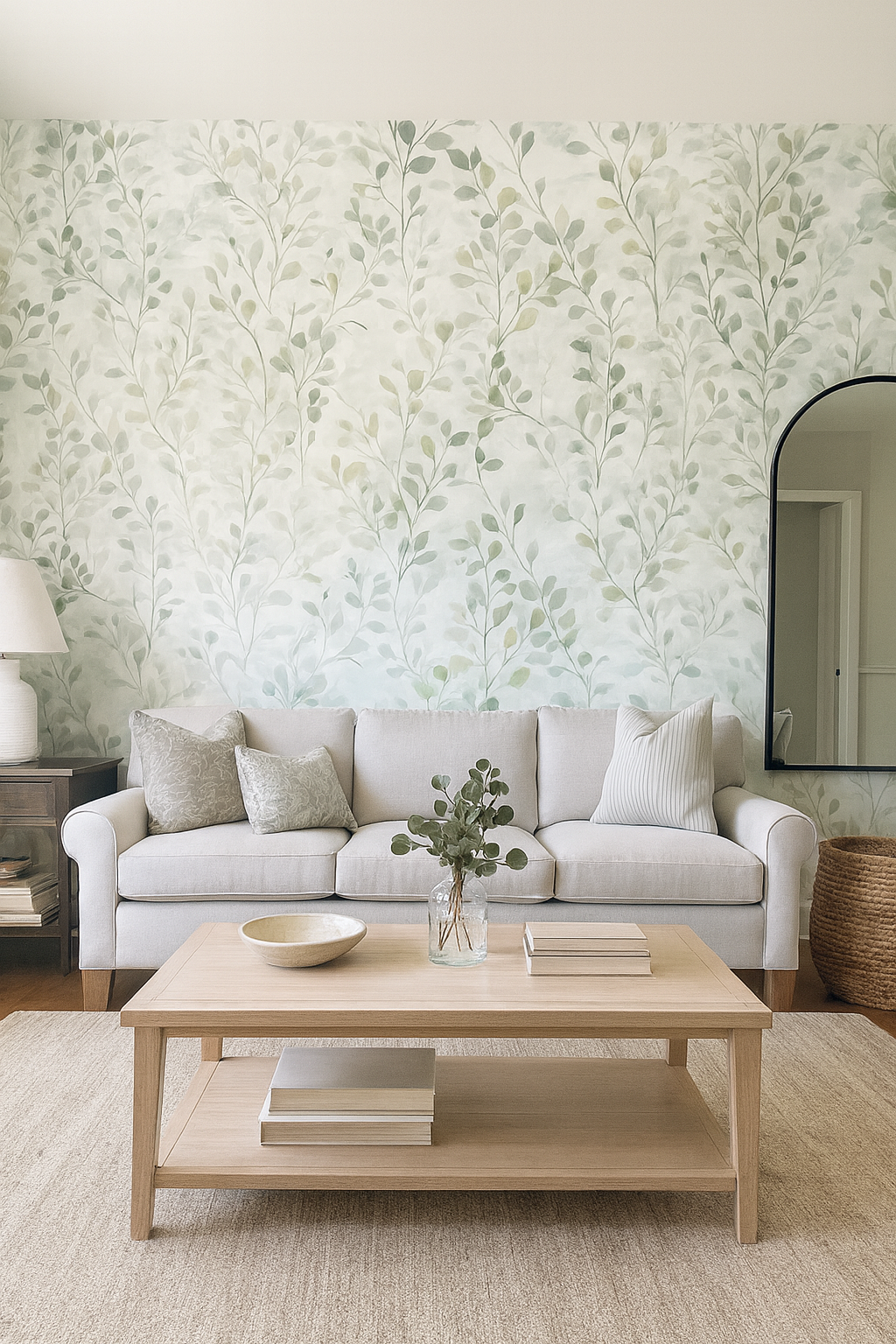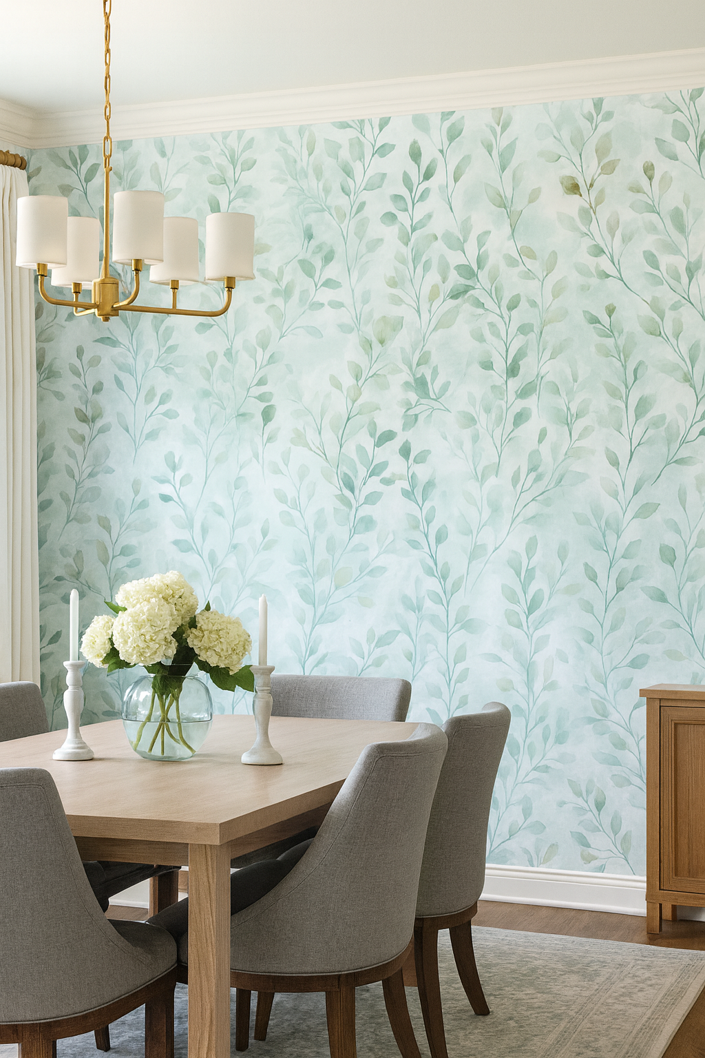 Airy and tranquil, this design evokes the feeling of a soft breeze through a botanical conservatory. Painted in watery layers of celadon, sage, and muted teal, delicate olive and eucalyptus stems drift across a translucent pale aqua backdrop. The ethereal nature of the pattern makes it well-suited for spa environments, bedding, or wellness-focused branding. A calm design that breathes.