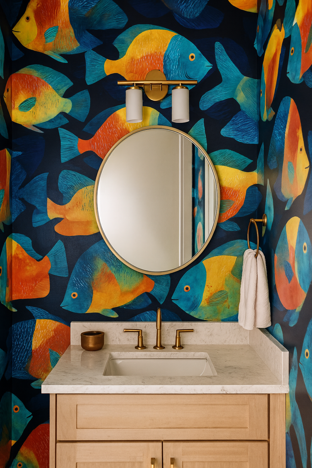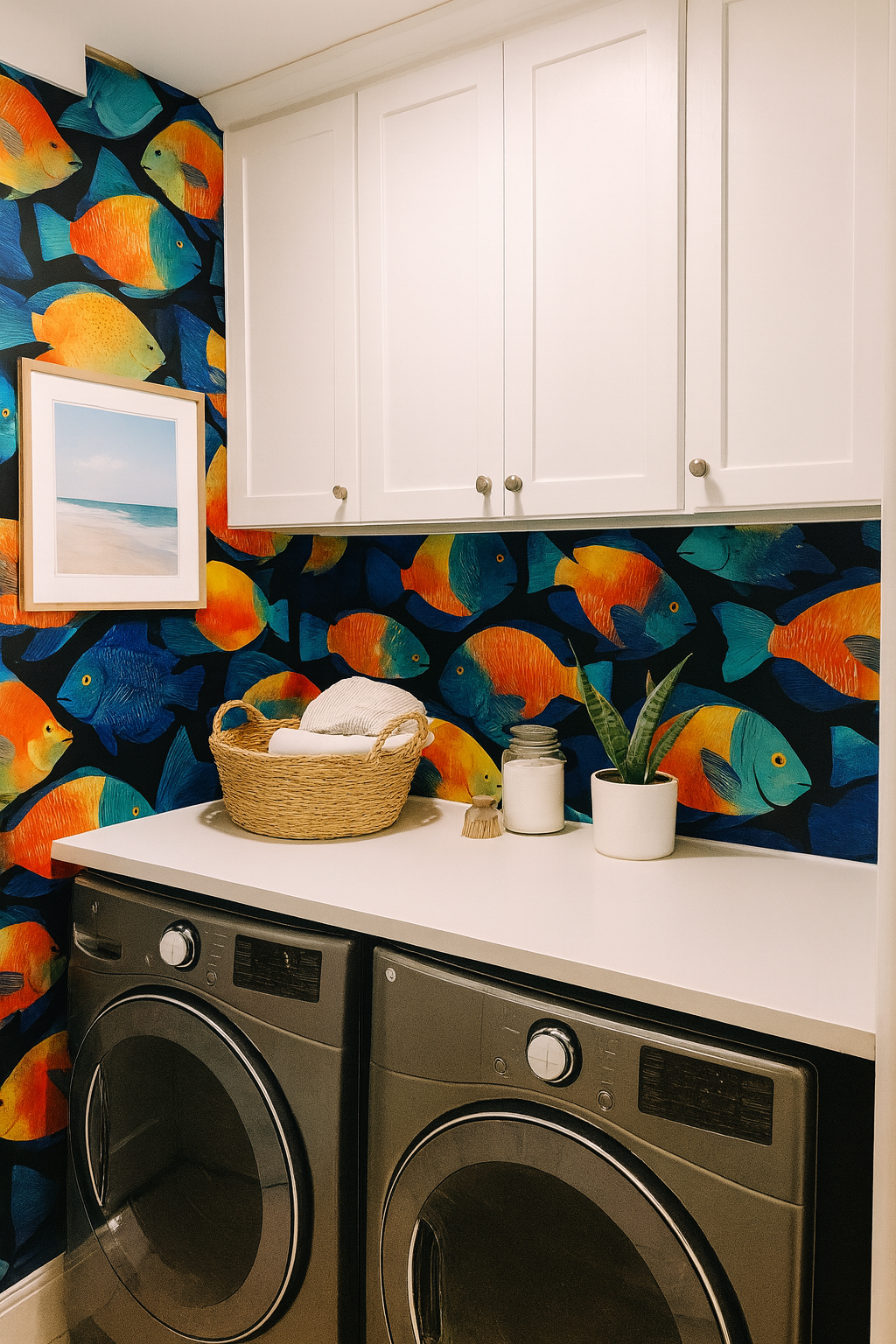 Bright, playful, and boldly tropical—this pattern is a kaleidoscope of reef life. Painted in saturated watercolor strokes, the fish burst with vivid oranges, electric teals, sunny yellows, and ocean blues, swimming against a dramatic black background. There’s a joyful, almost childlike whimsy here, yet it still feels sophisticated. Use this in statement accent pillows, resortwear, or kids’ room murals with a contemporary coastal flair.
