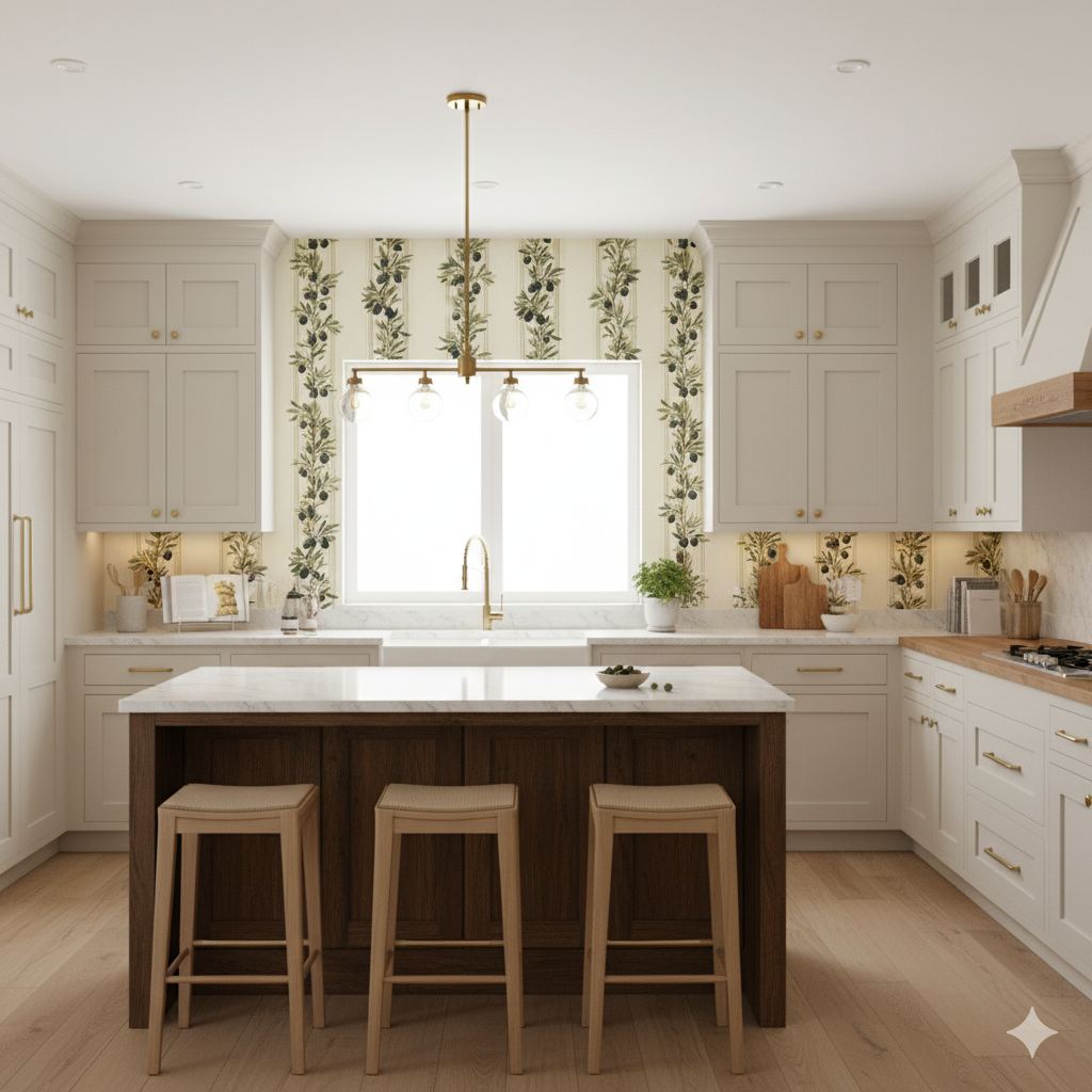 Vertical stripes built from slender olive branches, each heavy with glossy black fruit, march across a softly textured cream backdrop. The effect is both rhythmic and organic, merging the refinement of a stripe with the lushness of orchard abundance. The palette — muted greens, soft taupes, and dark olives — conjures the warmth of Mediterranean kitchens and rustic villas. Perfect for a dining space, breakfast nook, or wine cellar, this pattern infuses a home with the sense of sunlit terraces and shared meals. When paired with stone counters, wooden furniture, or clay accents, it completes a timeless look rooted in natural abundance and understated elegance.