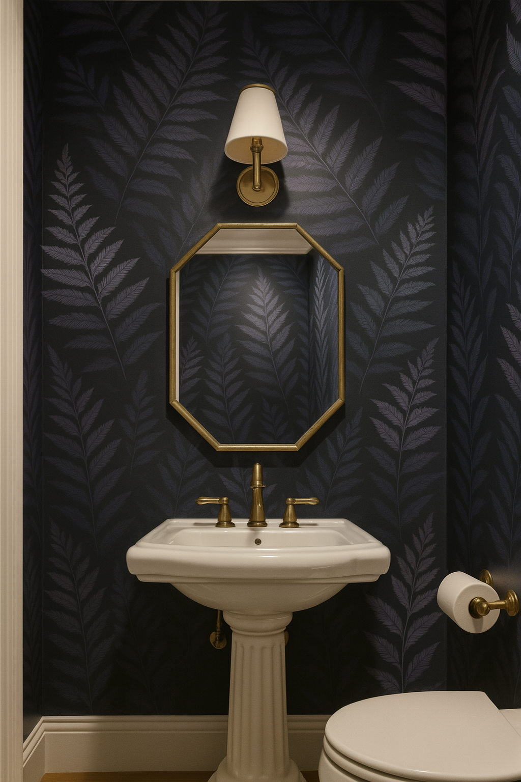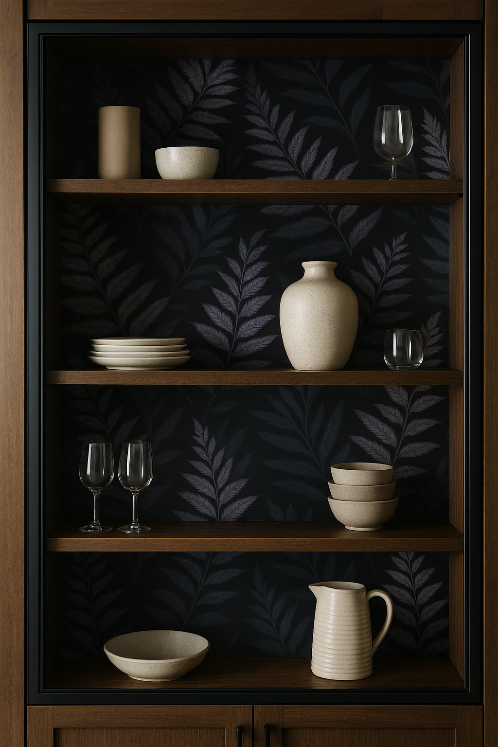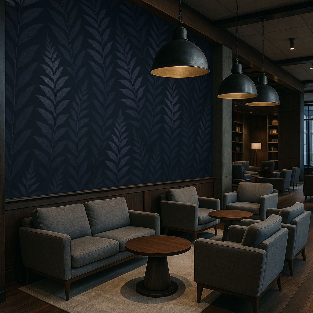 Twilight Fern Wallpaper creates an elegant, moody atmosphere with layered fern fronds in silver gray and lavender against a deep charcoal backdrop. The rich texture and soft botanical flow make it perfect for bedrooms, dining rooms, or living spaces seeking a refined natural touch. A top choice for customers searching for moody botanical wallpaper, dark fern wallpaper, sophisticated floral wall coverings, or modern nature-inspired wallpaper for elegant interiors.