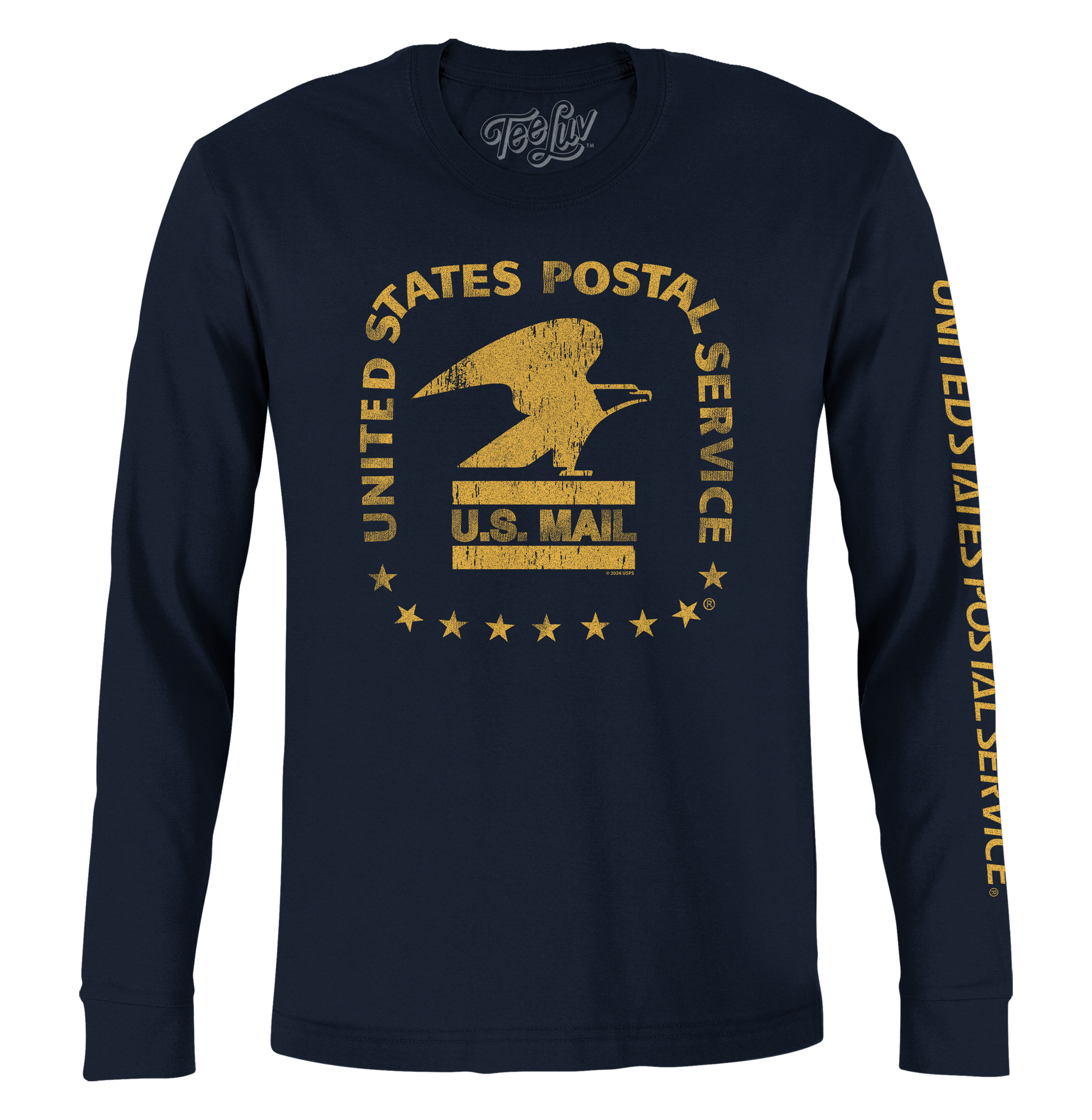 Founded in 1775 with Benjamin Franklin as the first Postmaster General, the United States Postal Service has been uniting Americans, one delivery at a time for nearly 250 years. We've paid tribute to the legacy of the USPS with a long sleeve graphic tee featuring the powerful, U.S. Mail "Standing Eagle" emblem on the chest, and the "United States Postal Service" text logo on the right sleeve. To complete the vintage look and feel of this USPS shirt - we've distressed the graphics and printed it on a soft, navy blue long sleeve tee.
