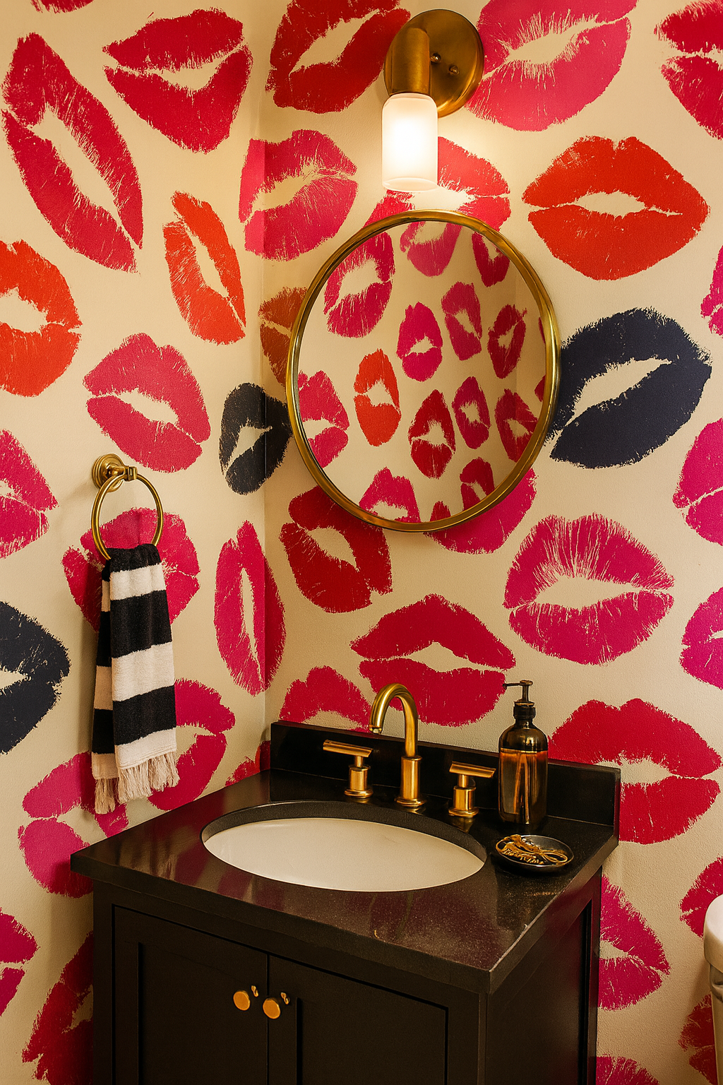This bold, playful design captures the essence of romance and rebellion in one striking pattern. Stamped lipstick marks in vibrant shades of crimson red, fuchsia pink, coral, and deep navy scatter across a creamy background, creating a pop-art inspired effect. The imperfect texture of each kiss adds character, like brushstrokes of affection, giving the wall both intimacy and energy. Perfect for a modern boudoir, a statement powder room, or even a chic bar or boutique space, Velvet Kiss balances cheekiness with glamour. It pairs beautifully with metallic accents, black lacquered furniture, or even minimalist white interiors that need a burst of unapologetic personality.
