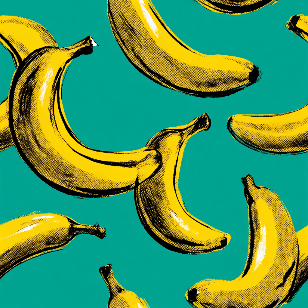 Golden bananas float against an aqua background, outlined in thick Pop Art black strokes. The playful Warhol-inspired repeat design transforms fruit into irreverent pop culture icons. Its humor and boldness make it perfect for eclectic kitchens, funky home bars, or conversation-starting powder rooms. Pair with glossy tiles, minimalist cabinetry, or retro chrome furnishings for maximum impact.