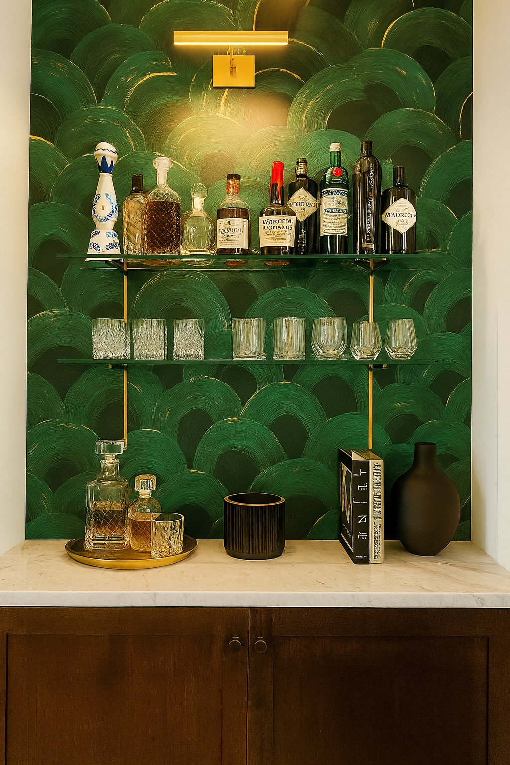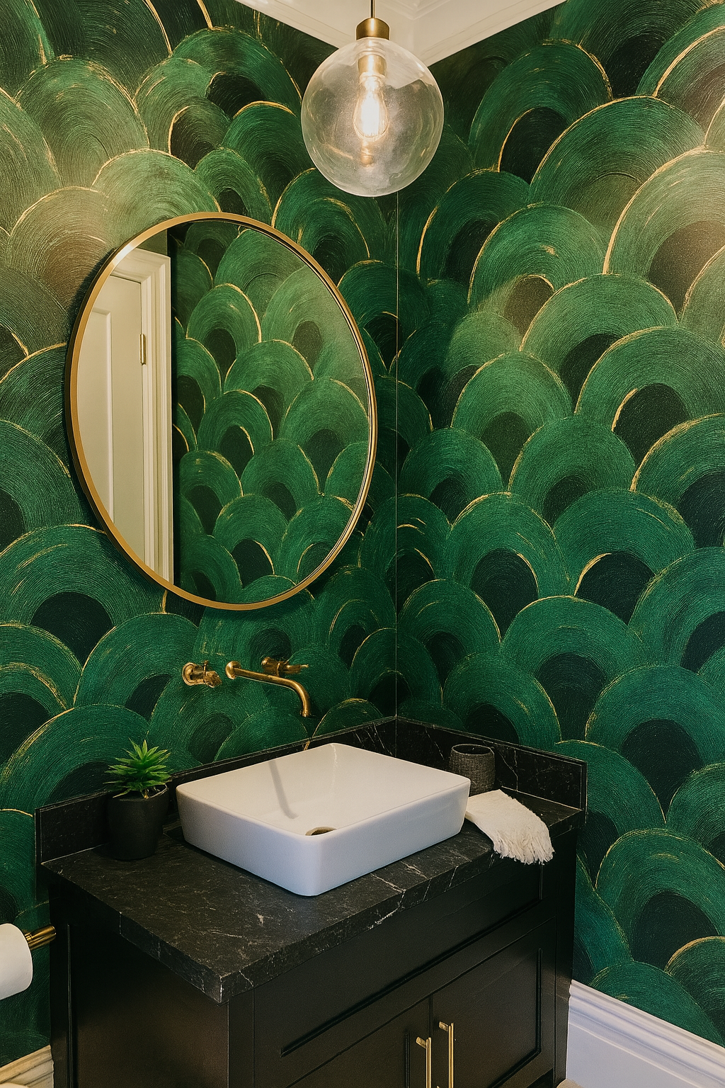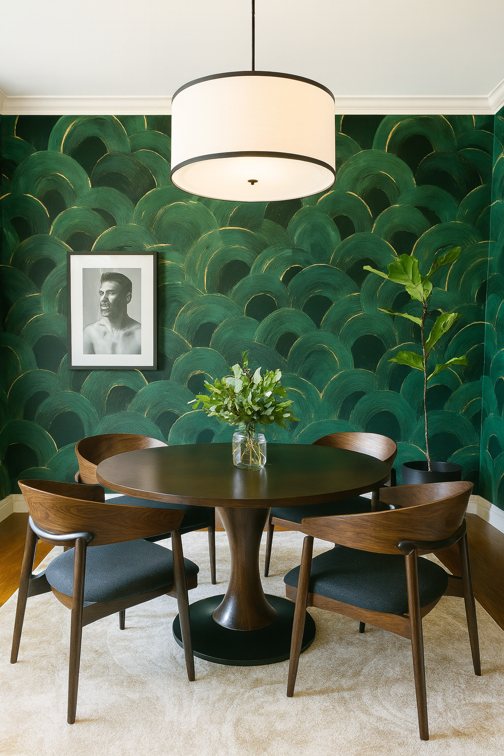 Verdant Echo layers broad emerald brushstrokes in overlapping arcs that resemble abstract forest canopies or wind-swept ferns. Subtle textures and hints of golden distressing add movement and visual richness. This pattern brings a painterly, organic energy into any space—perfect for artistic dining rooms, creative studios, or earthy modern interiors.