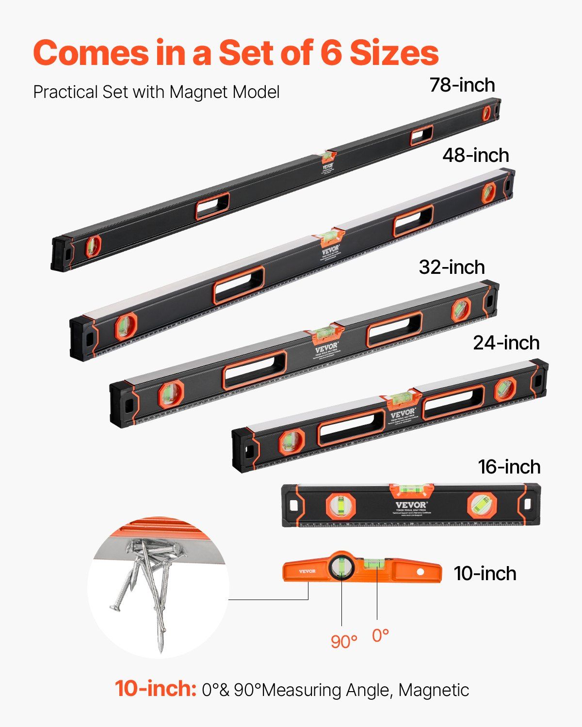Versatile Set of 6 Sizes: Our level set includes lengths of 10 inches, 16 inches, 24 inches, 32 inches, 48 inches, and 78 inches. The 10-inch level is magnetic and comes with 0° and 90° measurement angles, providing versatile measurement options