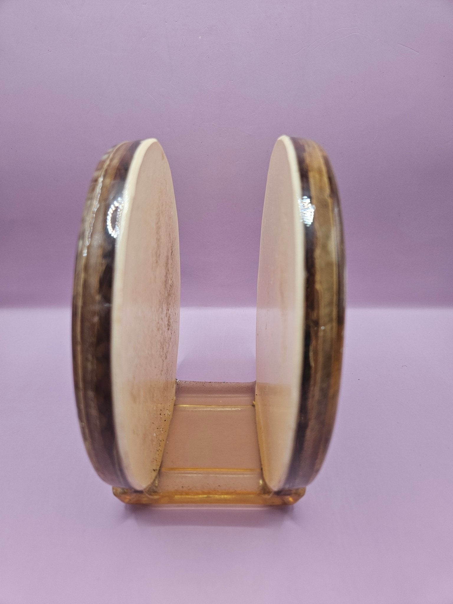 Add a touch of retro charm to your kitchen with this vintage 1970s circular lucite napkin holder. Featuring an intricate embedded seed and grain design, this durable acrylic piece is both functional and decorative. Measuring 5.25" x 2.8", it’s the perfect size to hold your napkins while making a stylish statement in your kitchen or dining area.