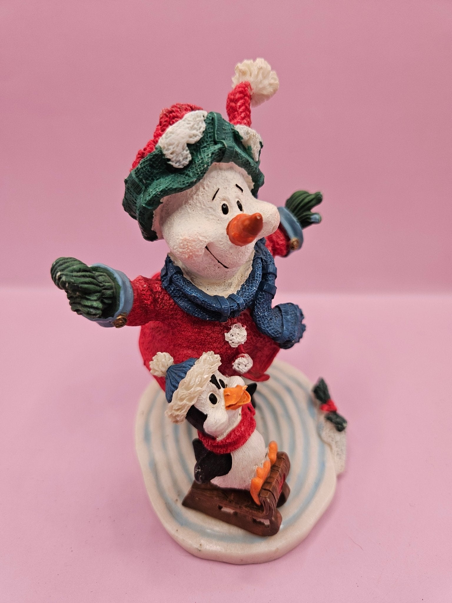 - Vintage figurine featuring an ice-skating snowman and penguin