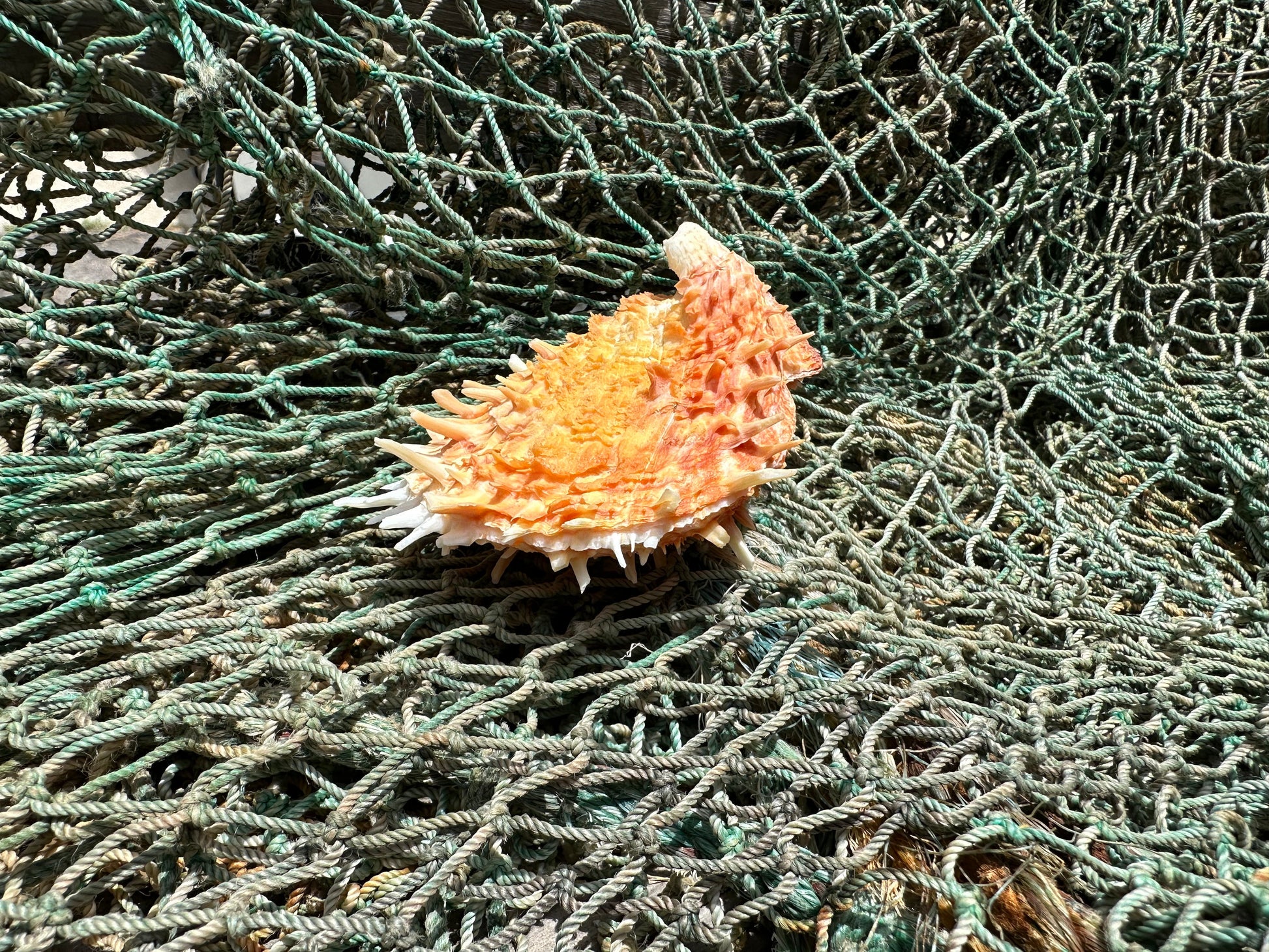 This shell has an orange and tan colored body with white and burnt orange spines.