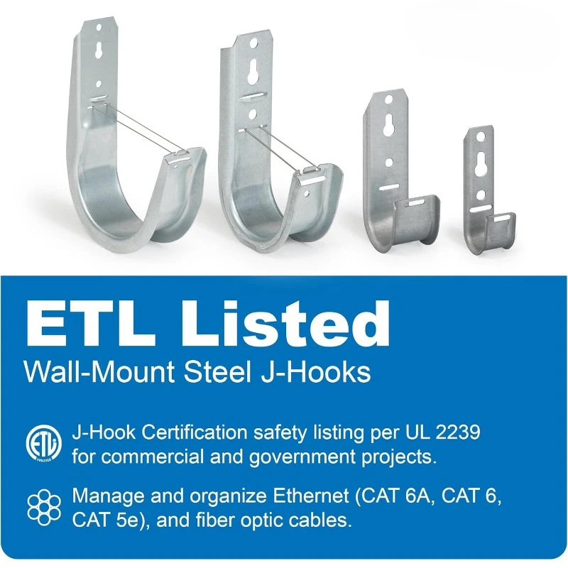 - ROBUST WALL CABLE MANAGEMENT - Wall Mount J-Hooks provides a practical solution for organizing and securing cables overhead. With a practical design and function, each J-Hook helps prevent tangled wires and keep cables neatly routed, providing proper support for category cables, fiber optic cables, inter-duct systems, and other low-voltage cabling requirements.