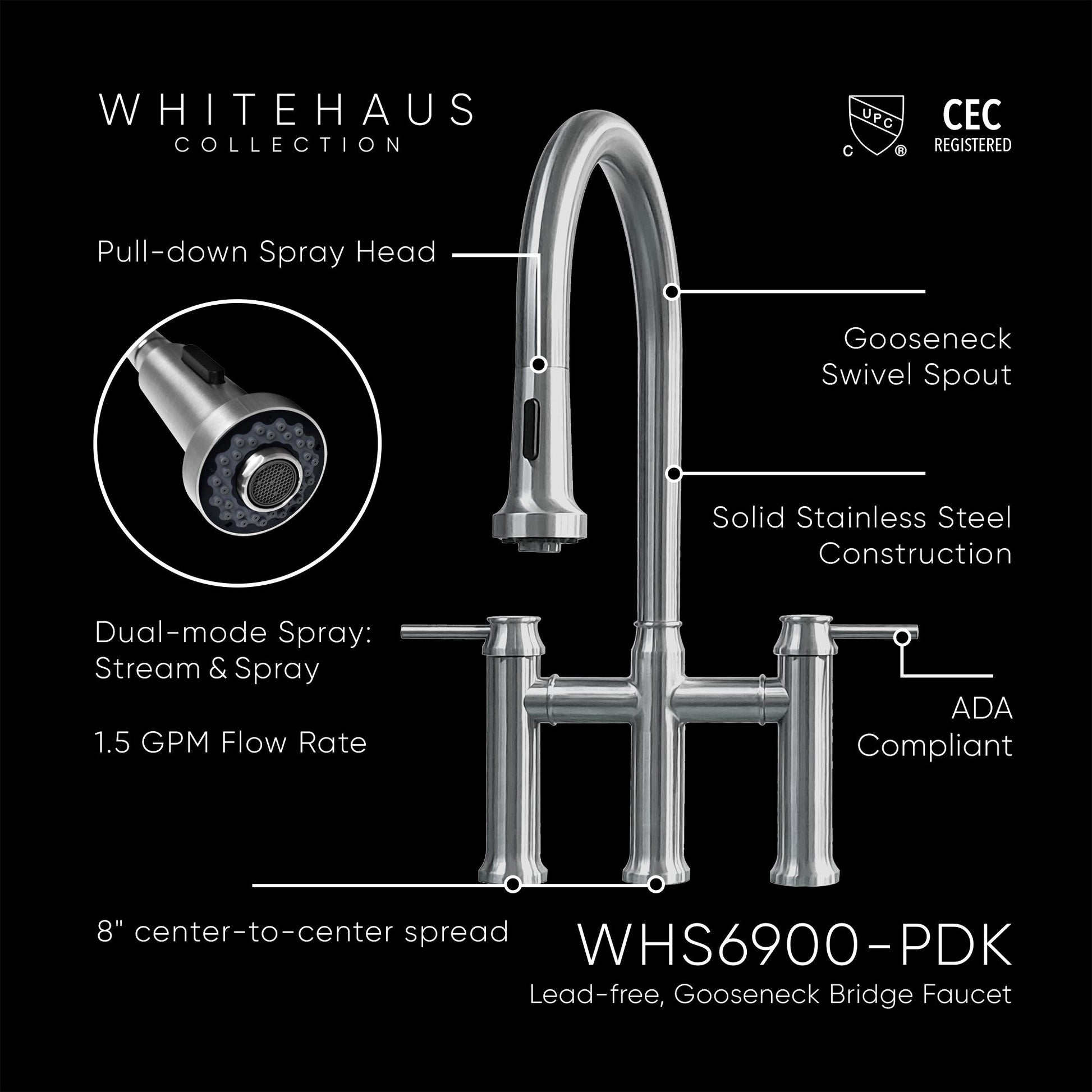 Waterhaus Lead-Free Solid Stainless Steel Bridge Faucet with a Gooseneck Swivel Spout, Pull Down Spray Head and Solid Lever Handles