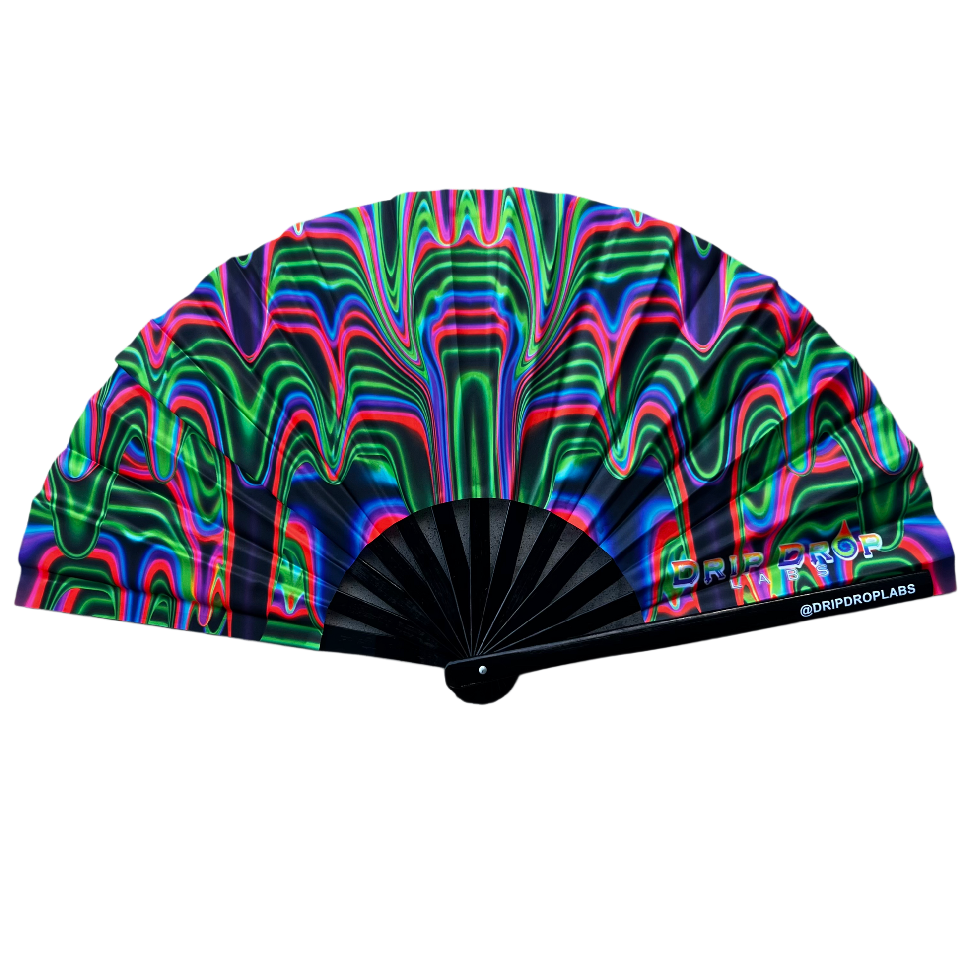 Stay cool and bold with the Watermelon Drip fan. The ooey, gooey, dripping design shines day and night, making a daring statement wherever you go. The UV reactive watermelon pattern creates a mesmerizing visual display under festival lights, combining fresh summer vibes with psychedelic appeal. Whether you're dancing through the night or taking a breather between sets, this fan keeps you comfortable while ensuring you stand out from the crowd.