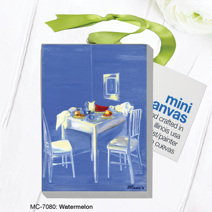 Watermelon, Mini Canvas (MC-7080A) is made in the USA from oil paintings by artist, Danilo Cuevas. Miniaturized images mounted on a mini canvas. Each arrive with a ribbon strand for easy hanging and display.