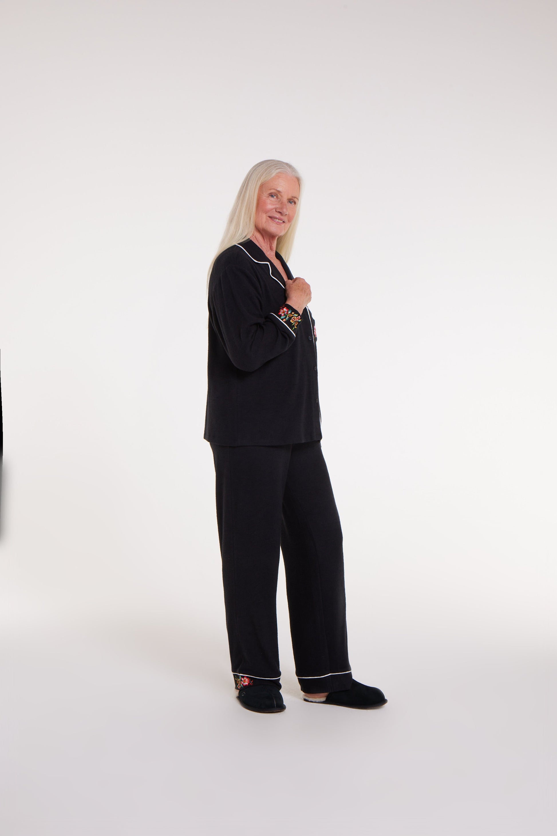 The women’s long sleeve pajama set is made with ultra soft jersey. It has magnetic closures and chest pockets. The front is accented with white piping and embroidery on the front pocket.