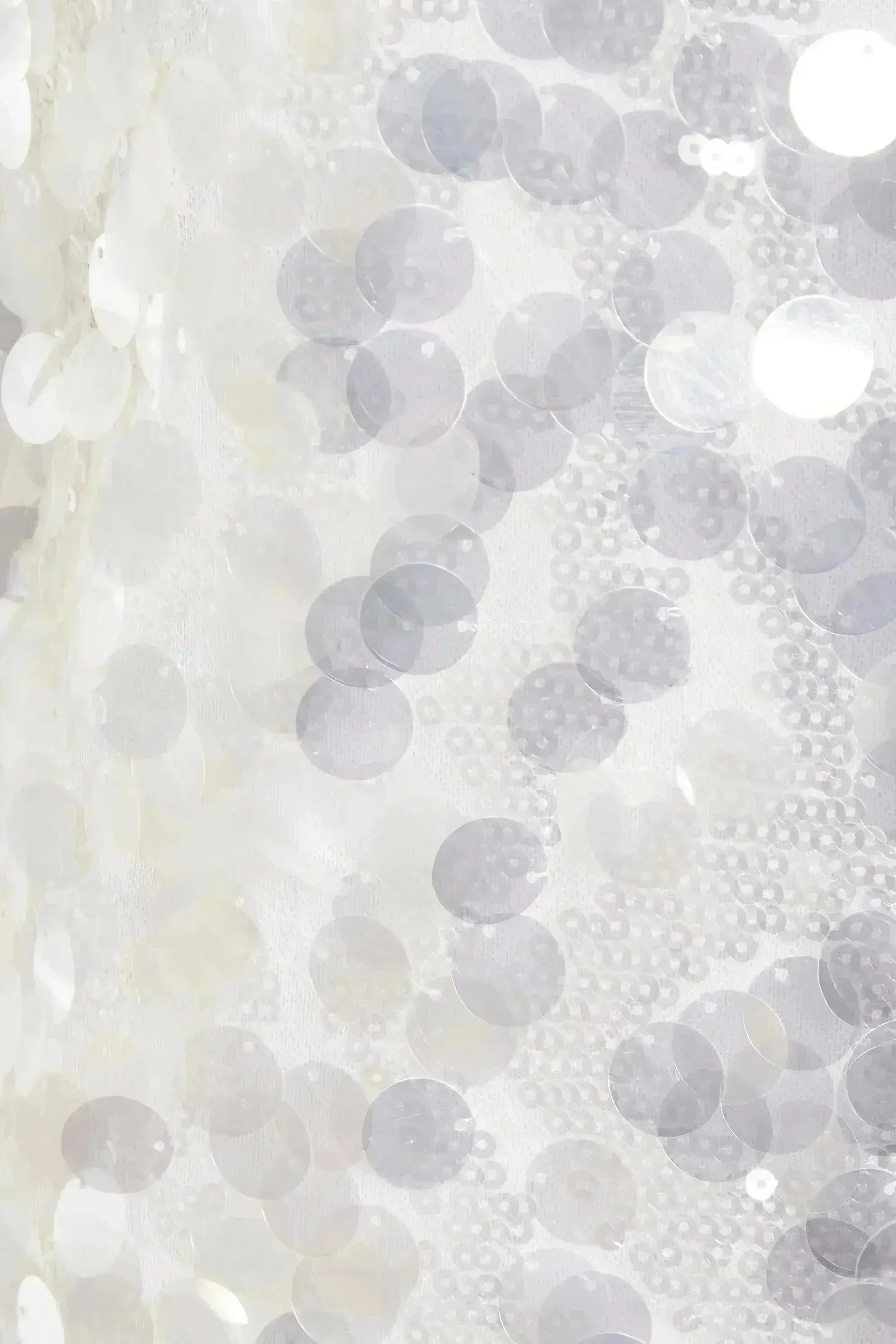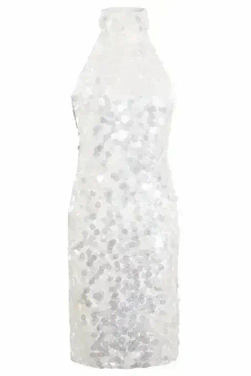 Sarvin white backless dress is made in Britain using metallic sequined mesh material and fully lined in sheer Ivory jersey fabric.