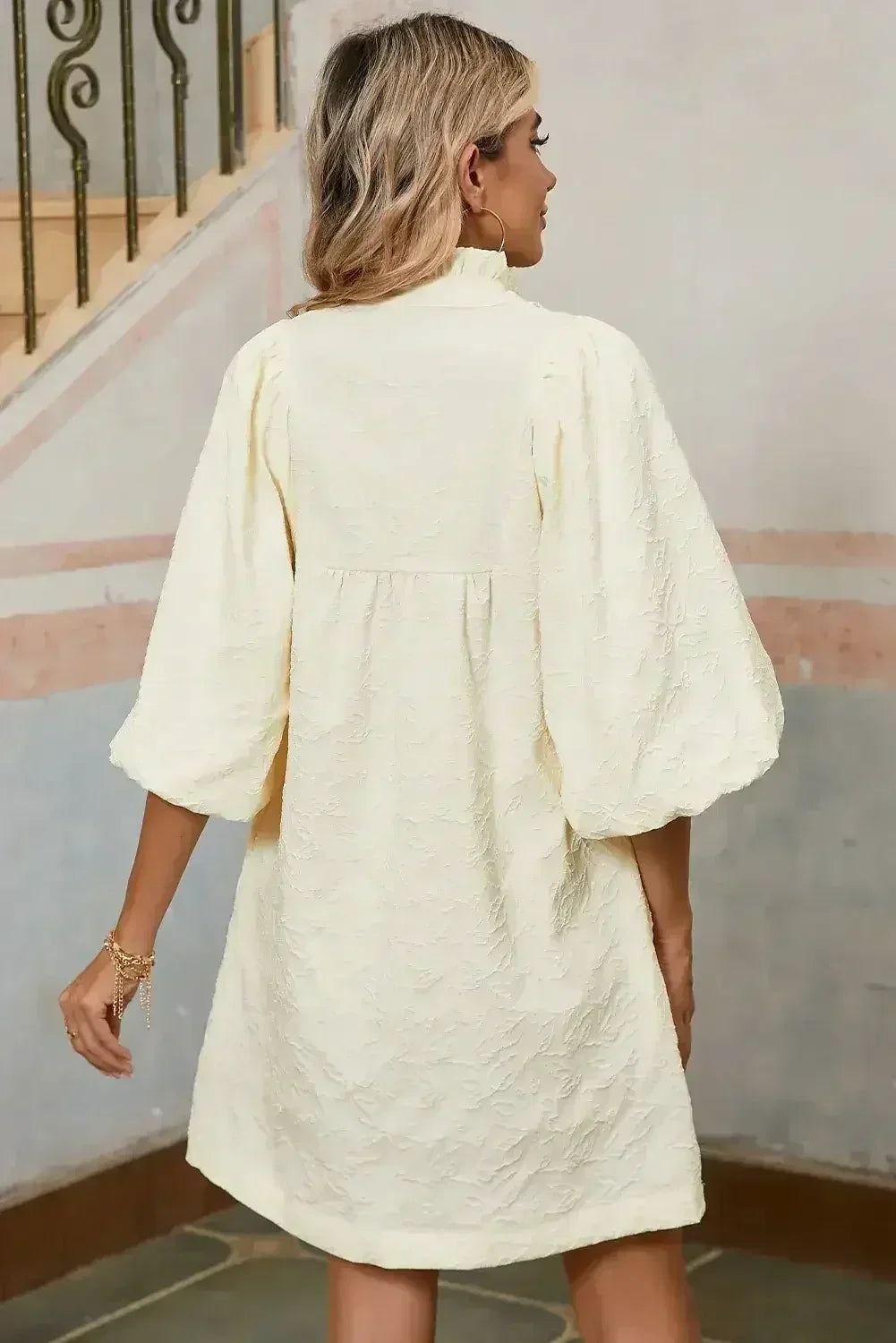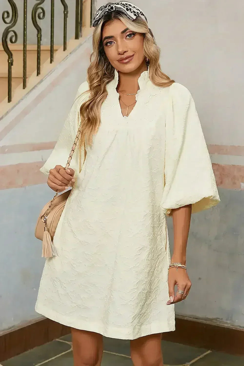 • Effortlessly elegant, this White Floral Textured Frill V Neck Mini Dress is perfect for both casual outings and special occasions.