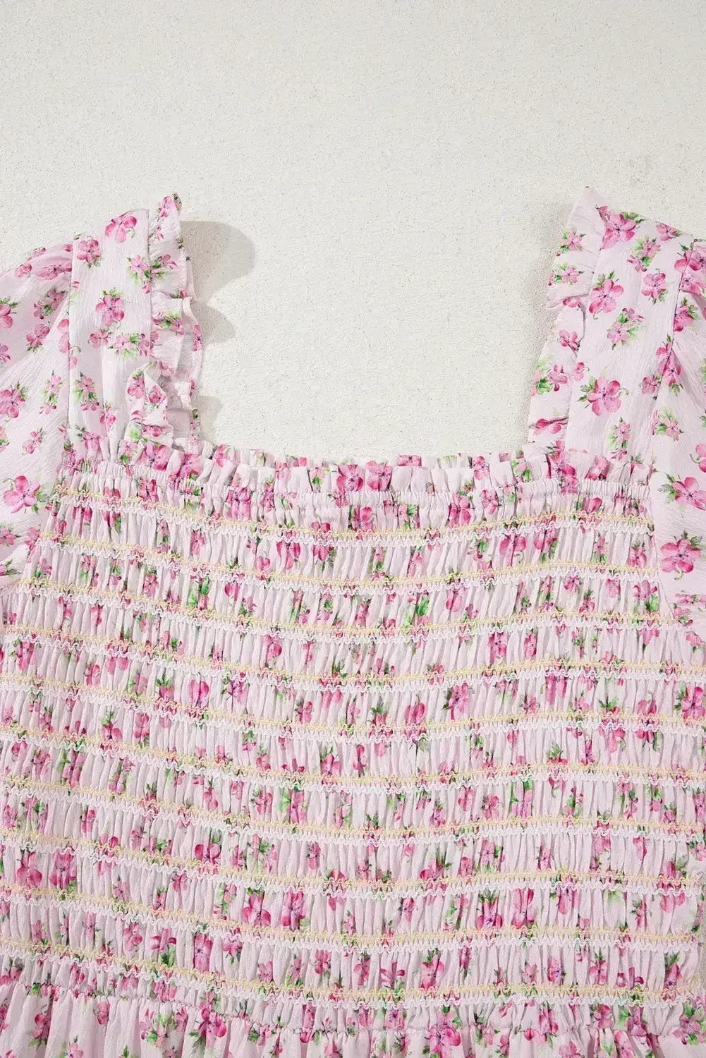 - This maxi dress features a charming frill neckline, a figure-flattering shirred bodice, a vibrant floral print, and a graceful flowing silhouette, creating a romantic and feminine look that is sure to make a statement.