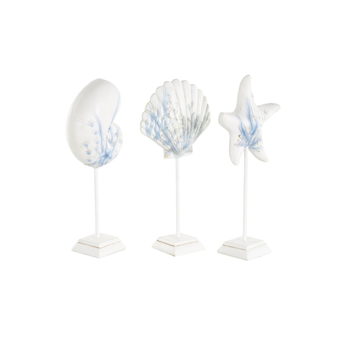 Design: A trio of sea life sculptures featuring a starfish, scallop shell, and nautilus shell on elegant stands