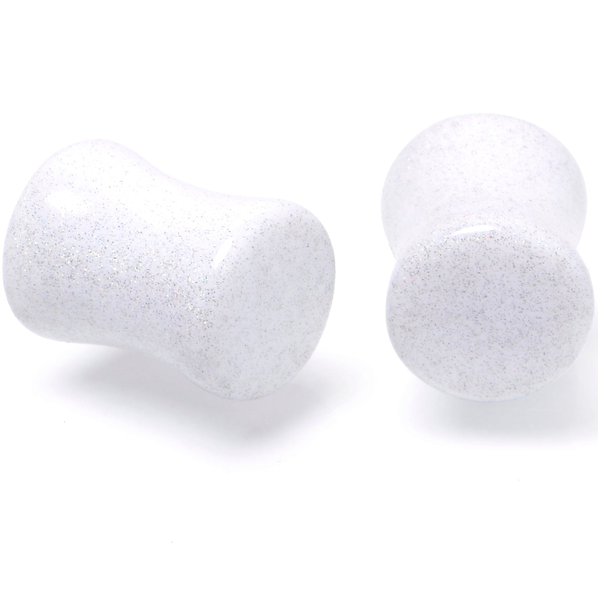 If your ears are eager for a hot new look, these saddle plugs may be able to satisfy your desires. These ear gauges are made with lightweight white acrylic and feature a striking shimmer finish. They feature a saddle design for comfortable insertion and removal. Double flare plug set in white glitter acrylic.