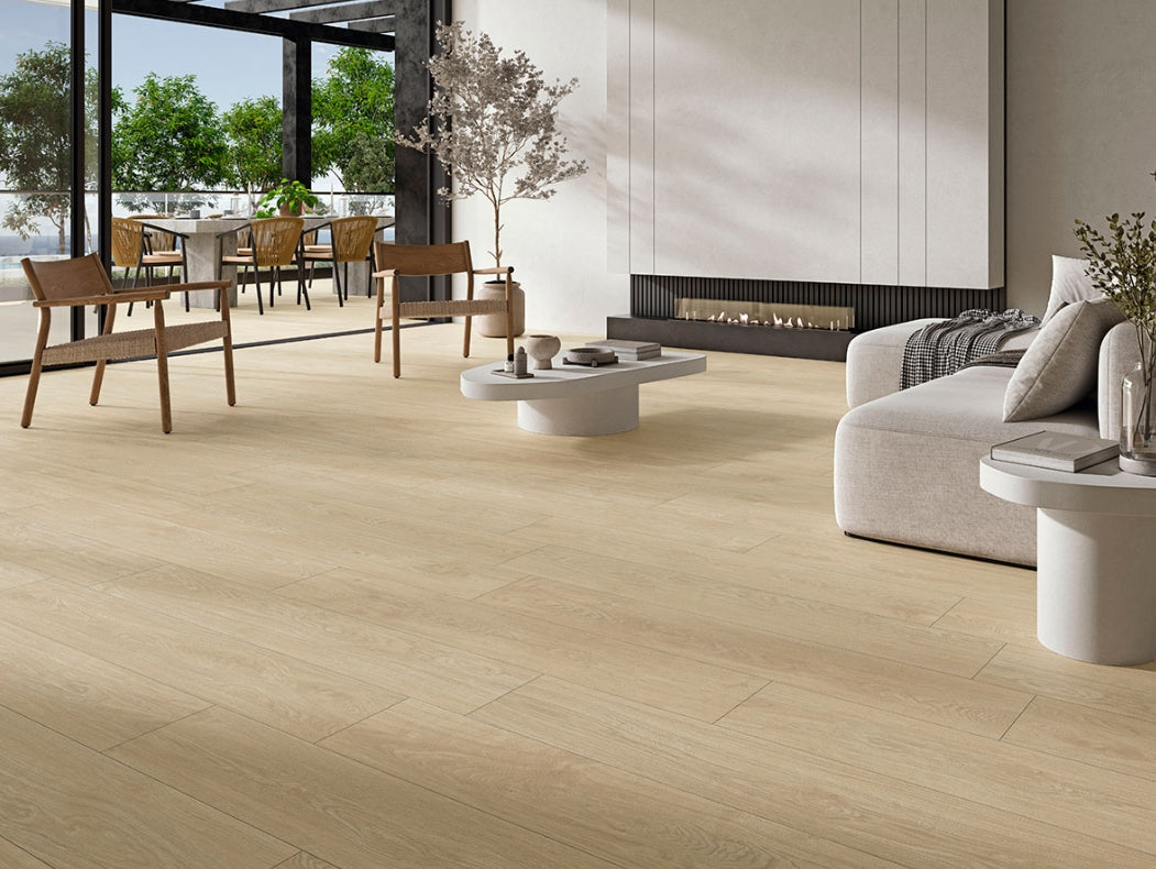 Revitalize your living areas with Whitehill Beckleywood porcelain tile, offered in an impressive 9” x 48” large format that commands attention in any setting. This contemporary porcelain wood tile embodies a simplistic Scandinavian vibe, featuring blonde tones with natural knots and grains for an authentic wood-look. Displaying a diverse array of distinctive wood grain patterns, each tile captures the intricate essence of real wood planks, ensuring a dynamic and organic aesthetic. Its polished matte finish radiates sophistication, while the pressed edge design guarantees classic appeal, suitable for both wall and floor installations. Whether accentuating charming backsplashes and walls or embellishing floors in residential or commercial spaces, this resilient porcelain tile effortlessly withstands daily wear and tear, boasting water, scratch, and stain-resistant properties. Embrace the durability and minimal upkeep of porcelain while maintaining the timeless appeal of genuine wood.
