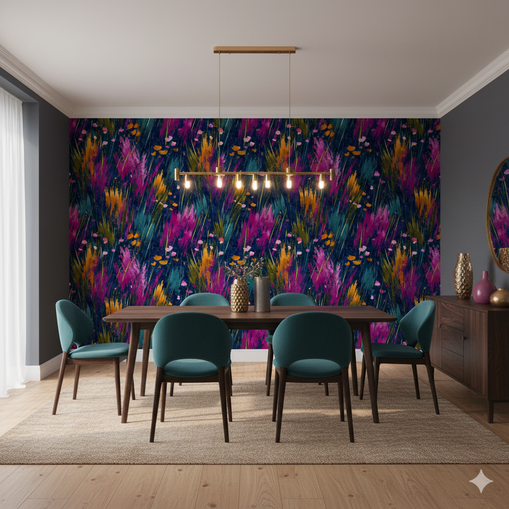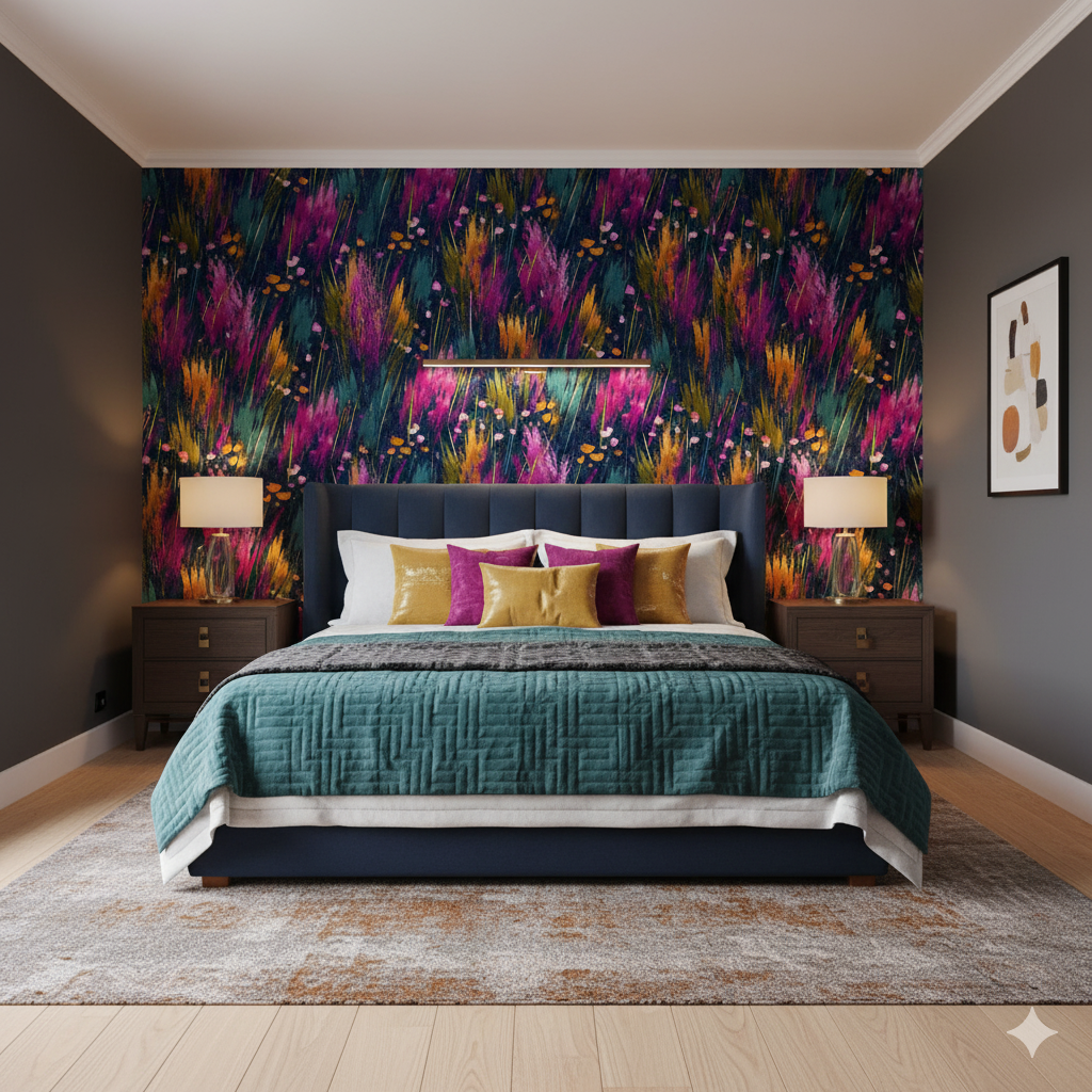 A rush of saturated color and sweeping movement, Wild Reverberation evokes the texture of windswept meadows at twilight. Magenta, teal, saffron, and indigo grasses seem to sway with unseen rhythm, painted with expressive strokes that feel almost musical. The result is dramatic and immersive — perfect for bold bedrooms or art-forward dining spaces. When lit with warm ambient light, the colors deepen into a velvet glow. It complements brass, walnut, and jewel-toned textiles beautifully, transforming any wall into a living painting.
