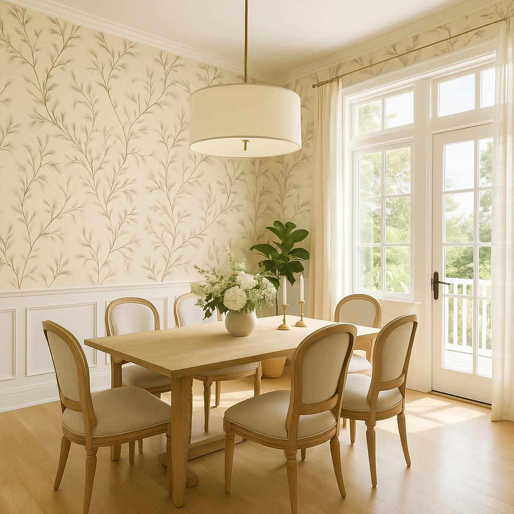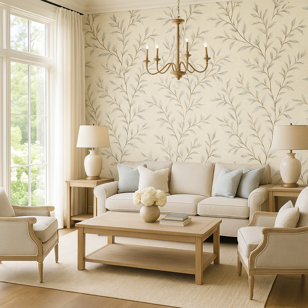 Delicate and ethereal, "Willow Whisper" paints a gentle scene of wispy willow branches in cool taupe and pale gray, set against a lightly textured parchment backdrop. The flowing, hand-drawn vines sway naturally across the surface, bringing a sense of softness and calm. Ideal for traditional dining rooms, vintage bedrooms, or elegant foyers, this toile-style botanical wallpaper whispers sophistication in every detail.