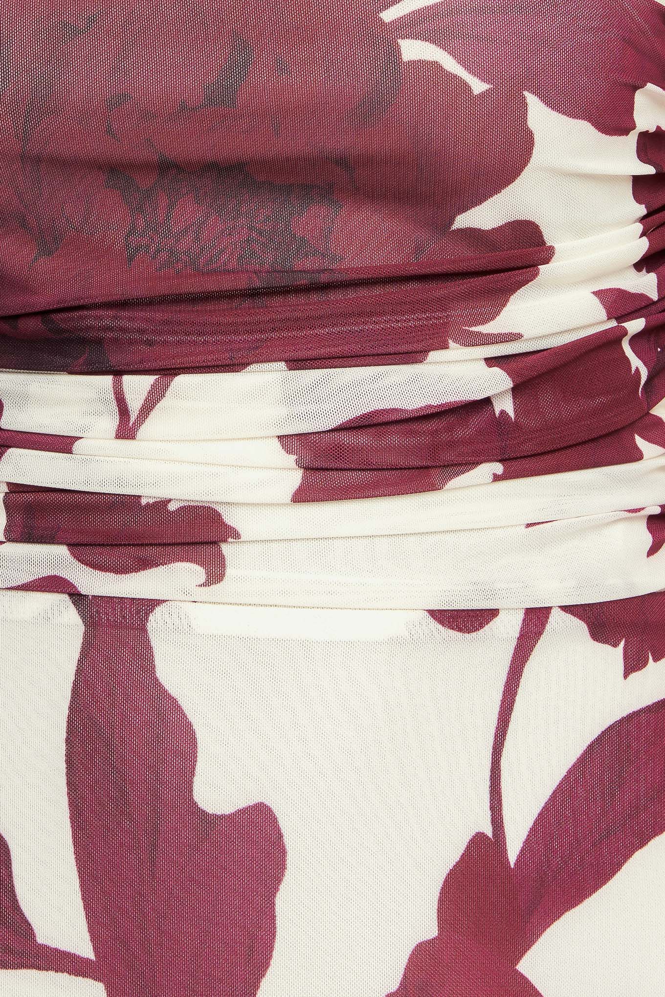 A printed power mesh midi dress featuring straight neckline, straps, side shirred bodice, circle skirt and back zipper closure