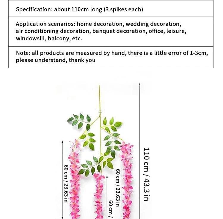 Wisteria artificial flowers blush leaf connections are firmer, flowers denser and more natural. Artificial Flowers Vines size of each fake flower vine about 3.6 Feet in length. Wisteria artificial flowers bulk per artificial wisteria with 3 branches, every branches flowers length is 19.5 inches.