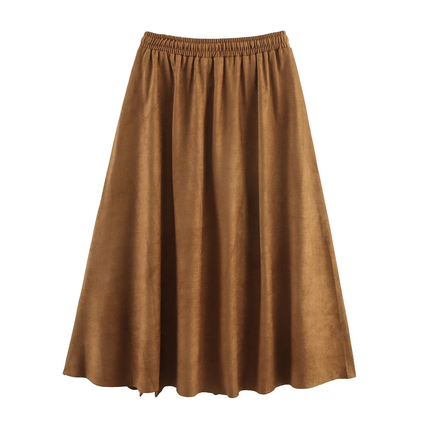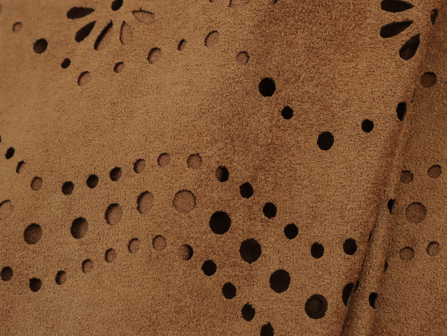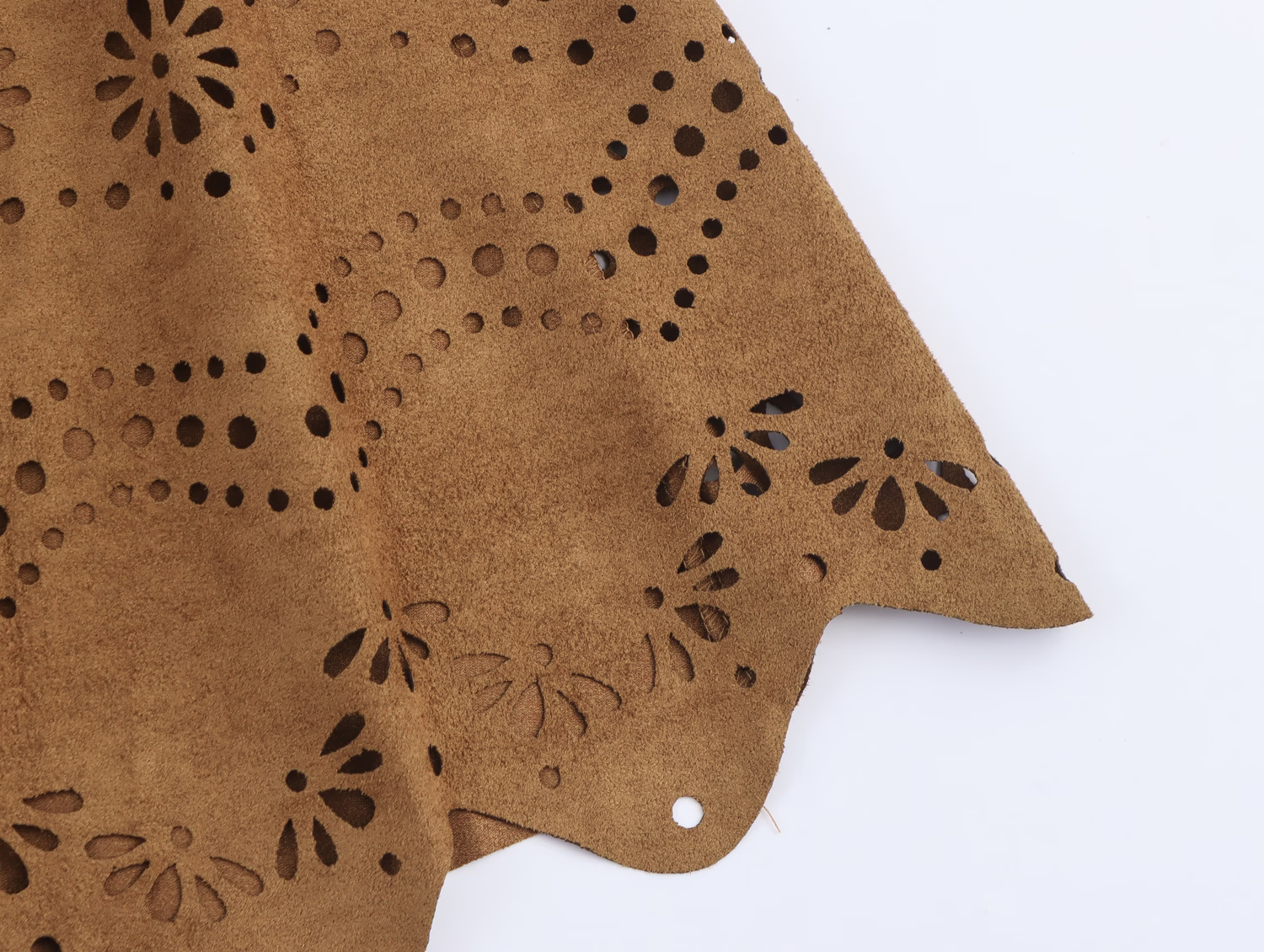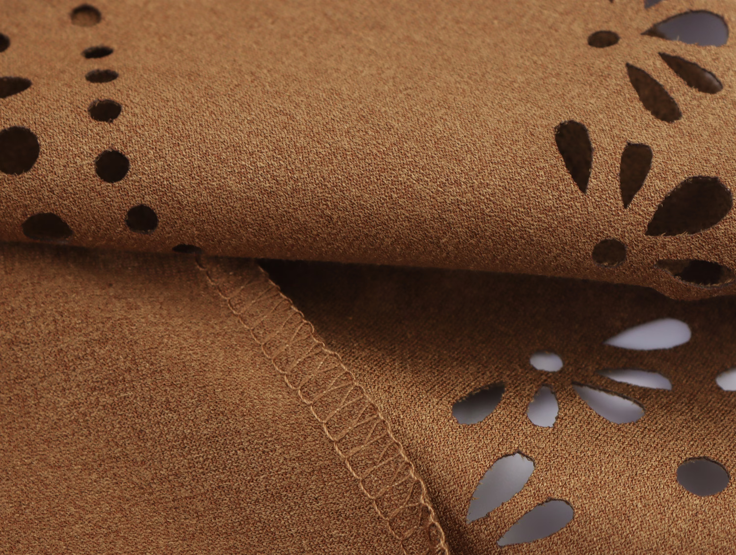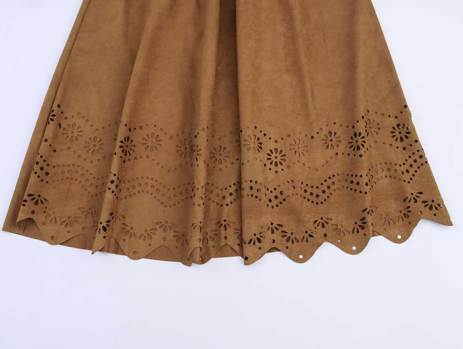 Women Clothing Autumn Retro Suede Laser Carved Hole Floral Vacation Skirt