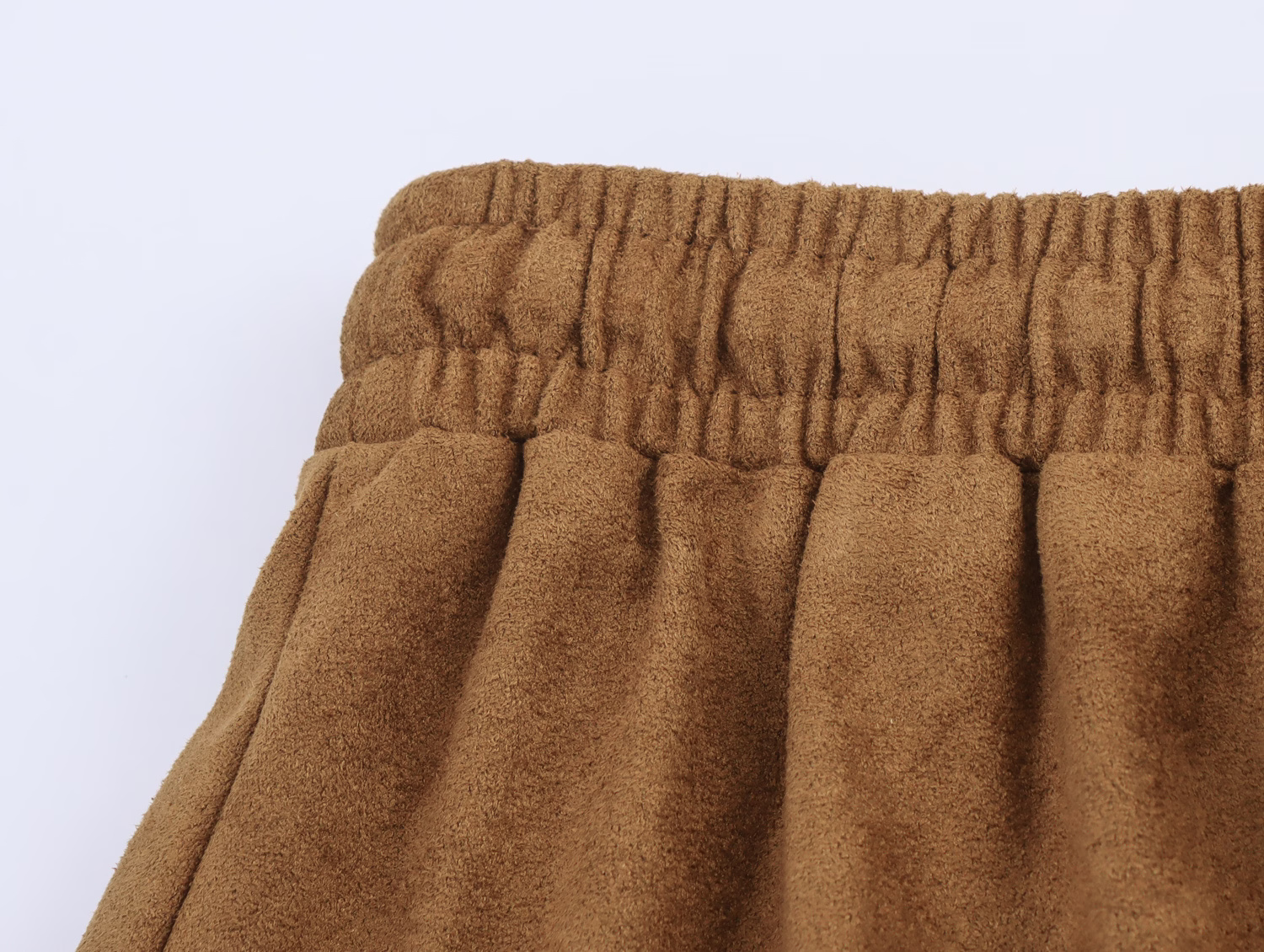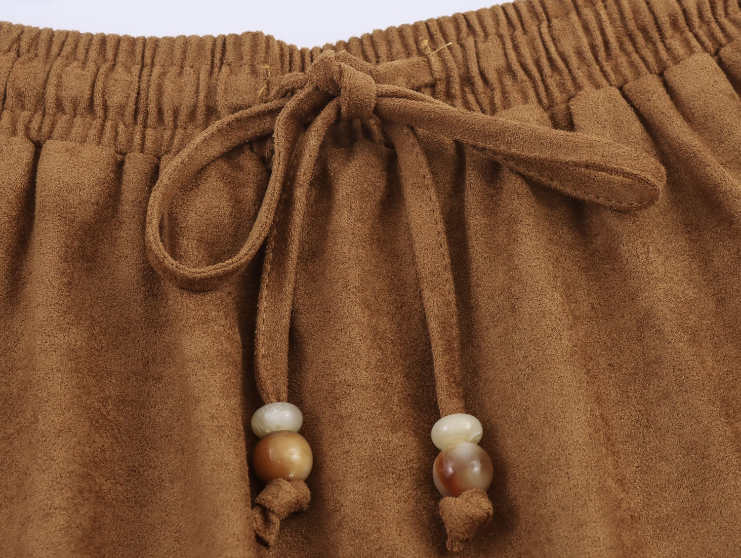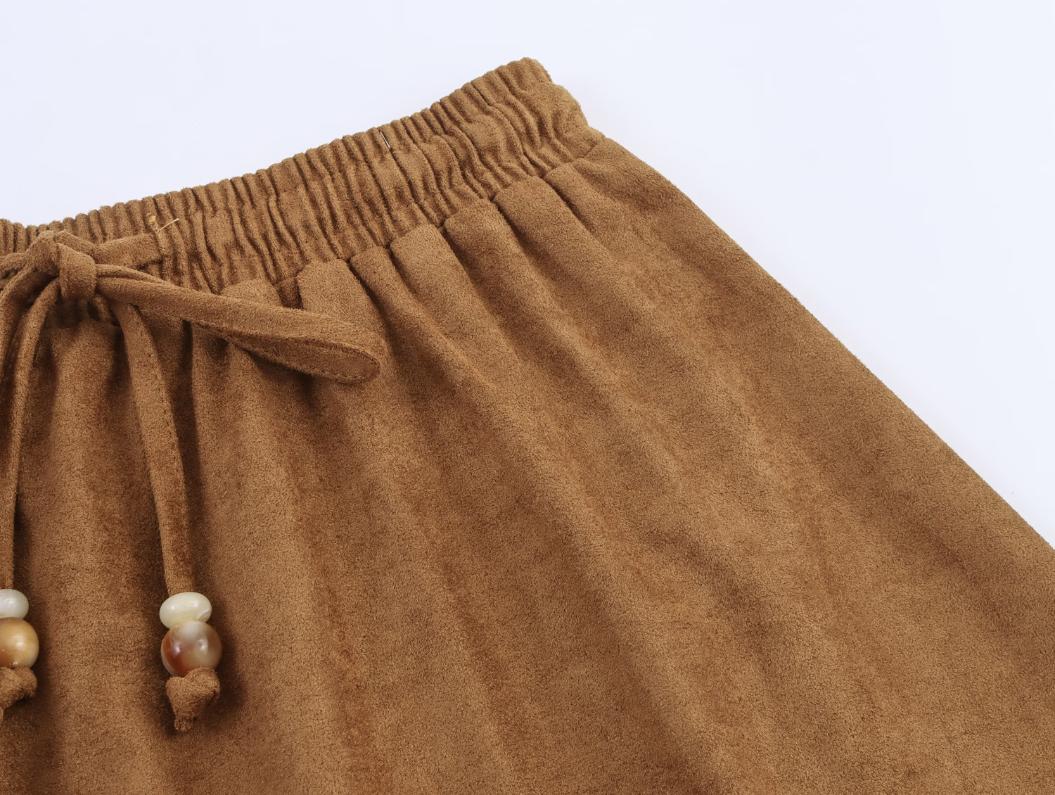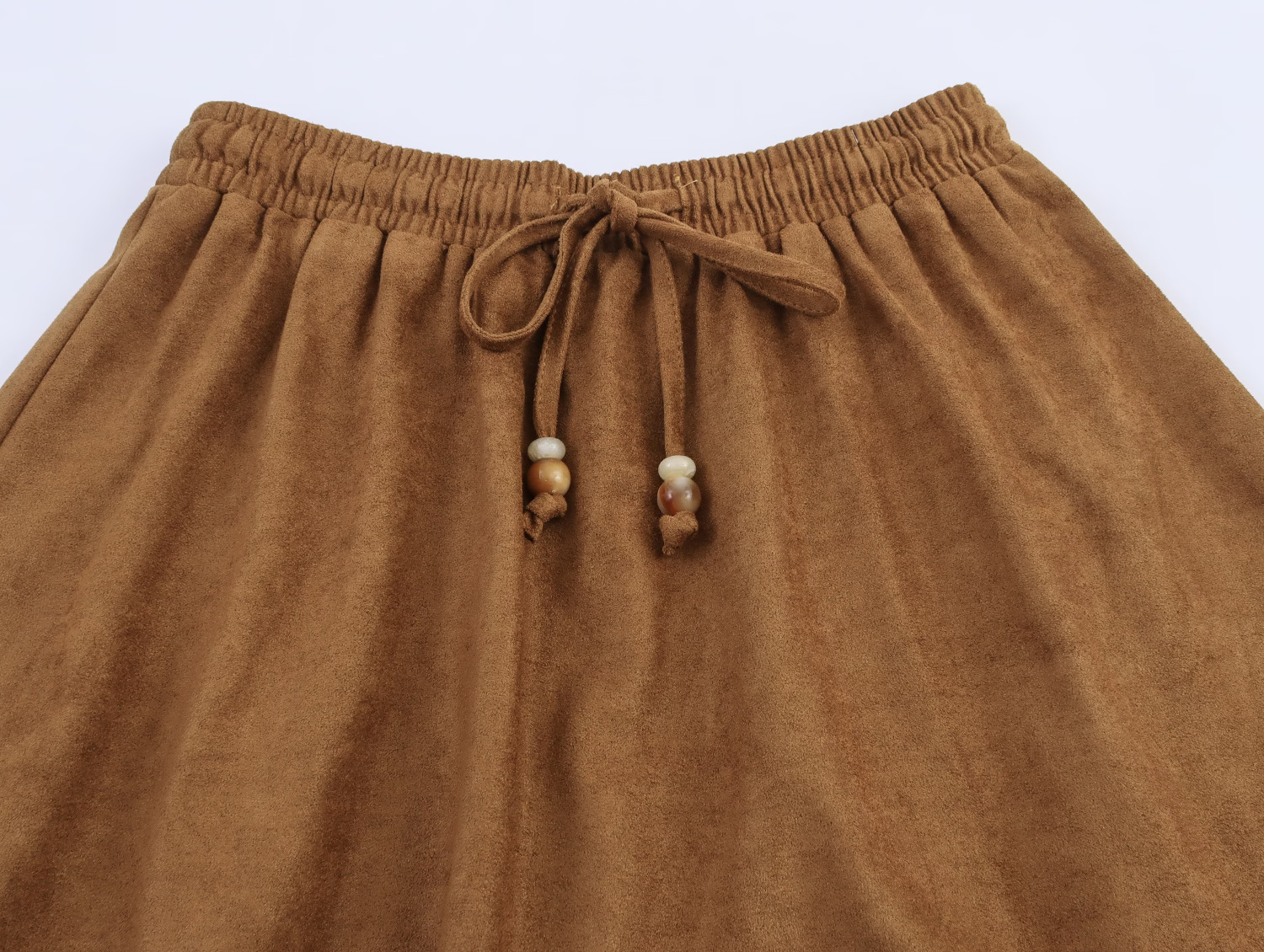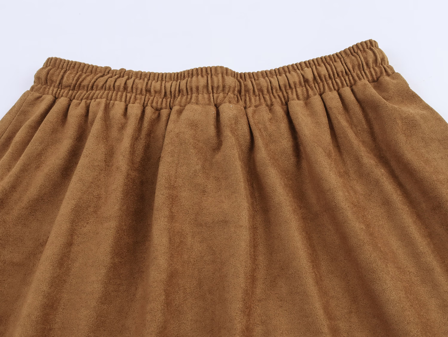 Women Clothing Autumn Retro Suede Laser Carved Hole Floral Vacation Skirt