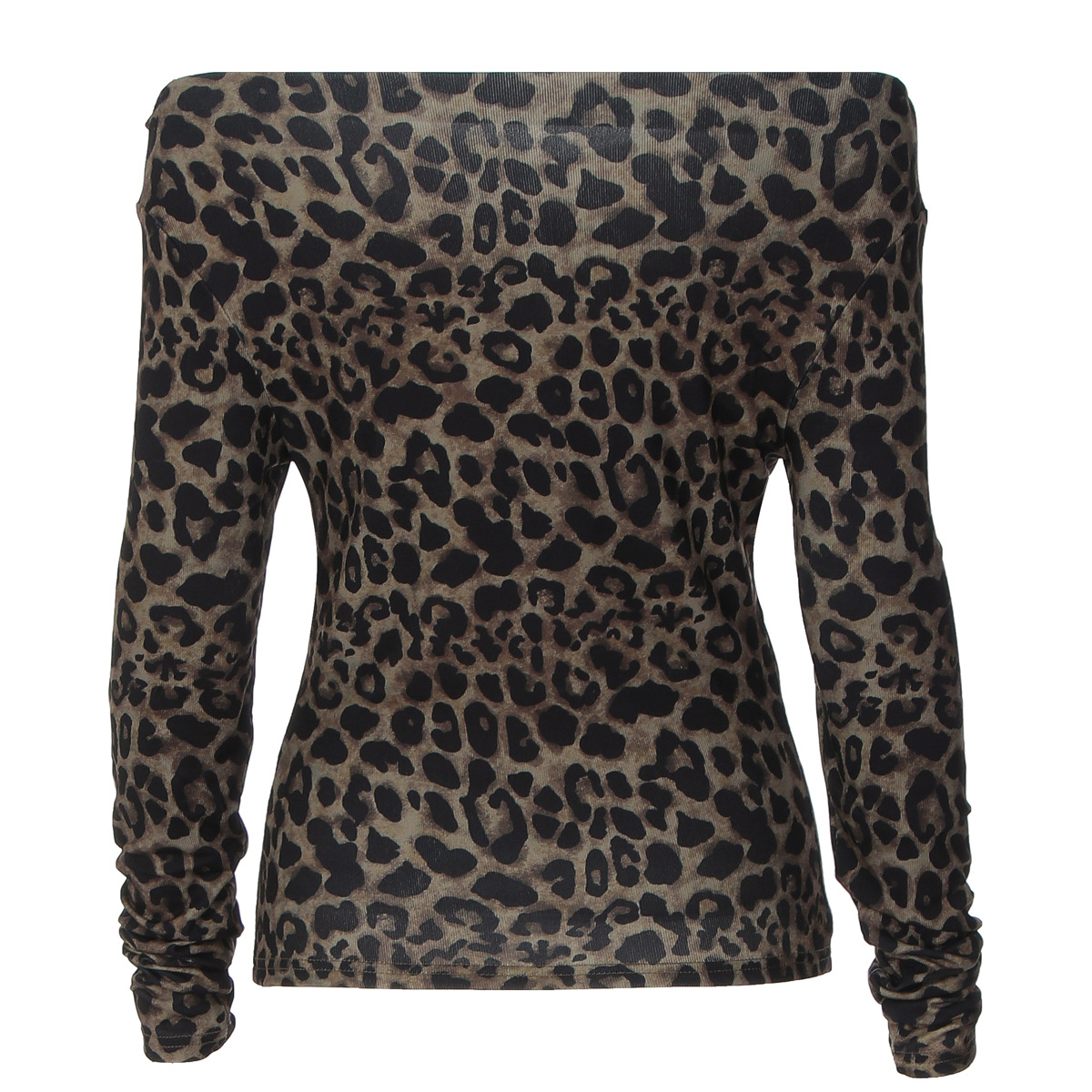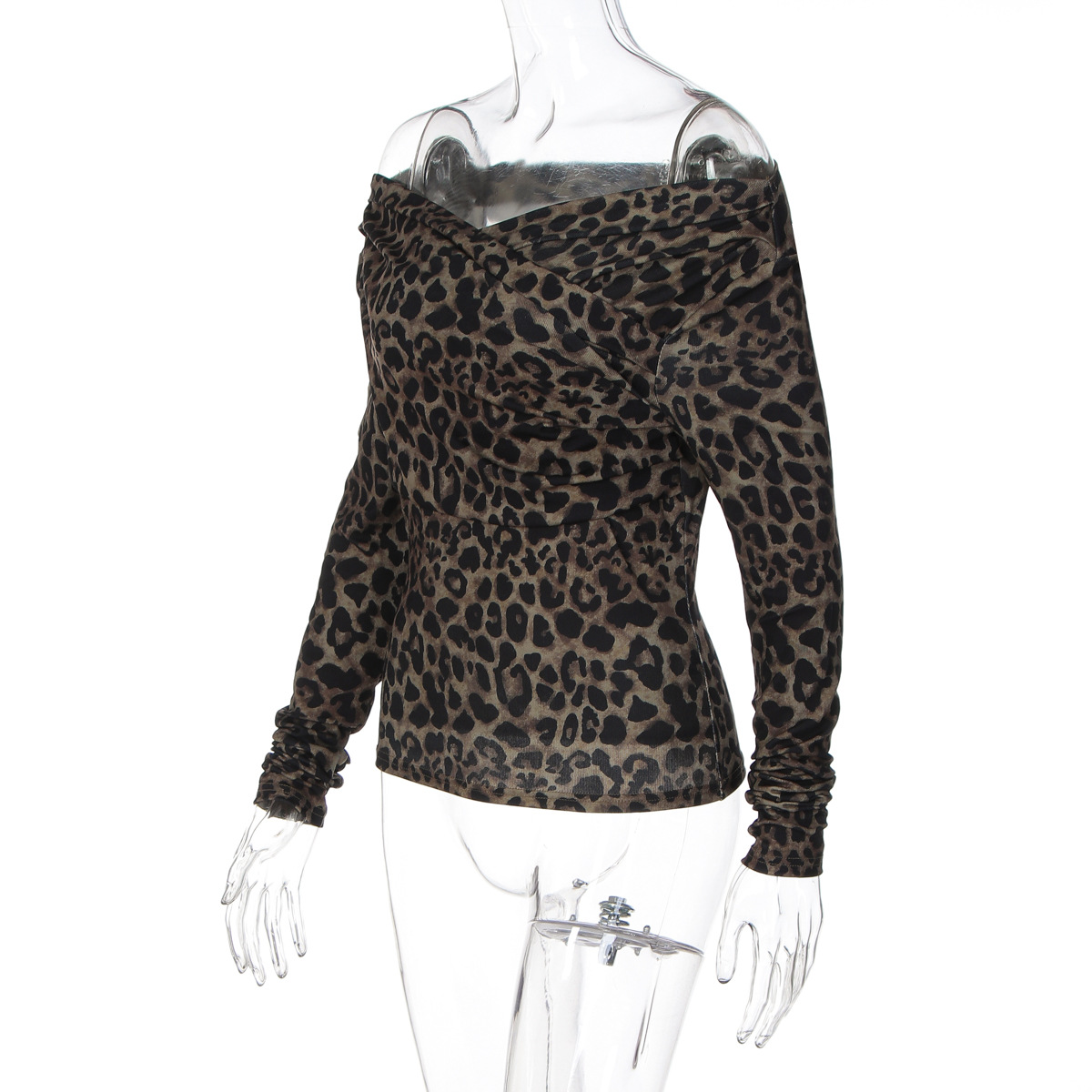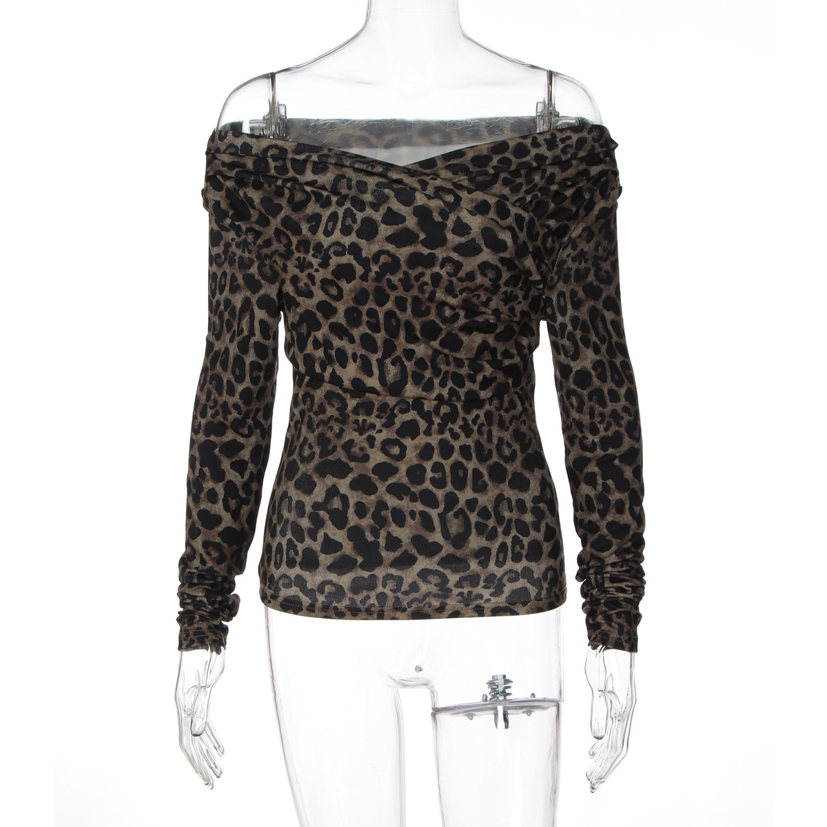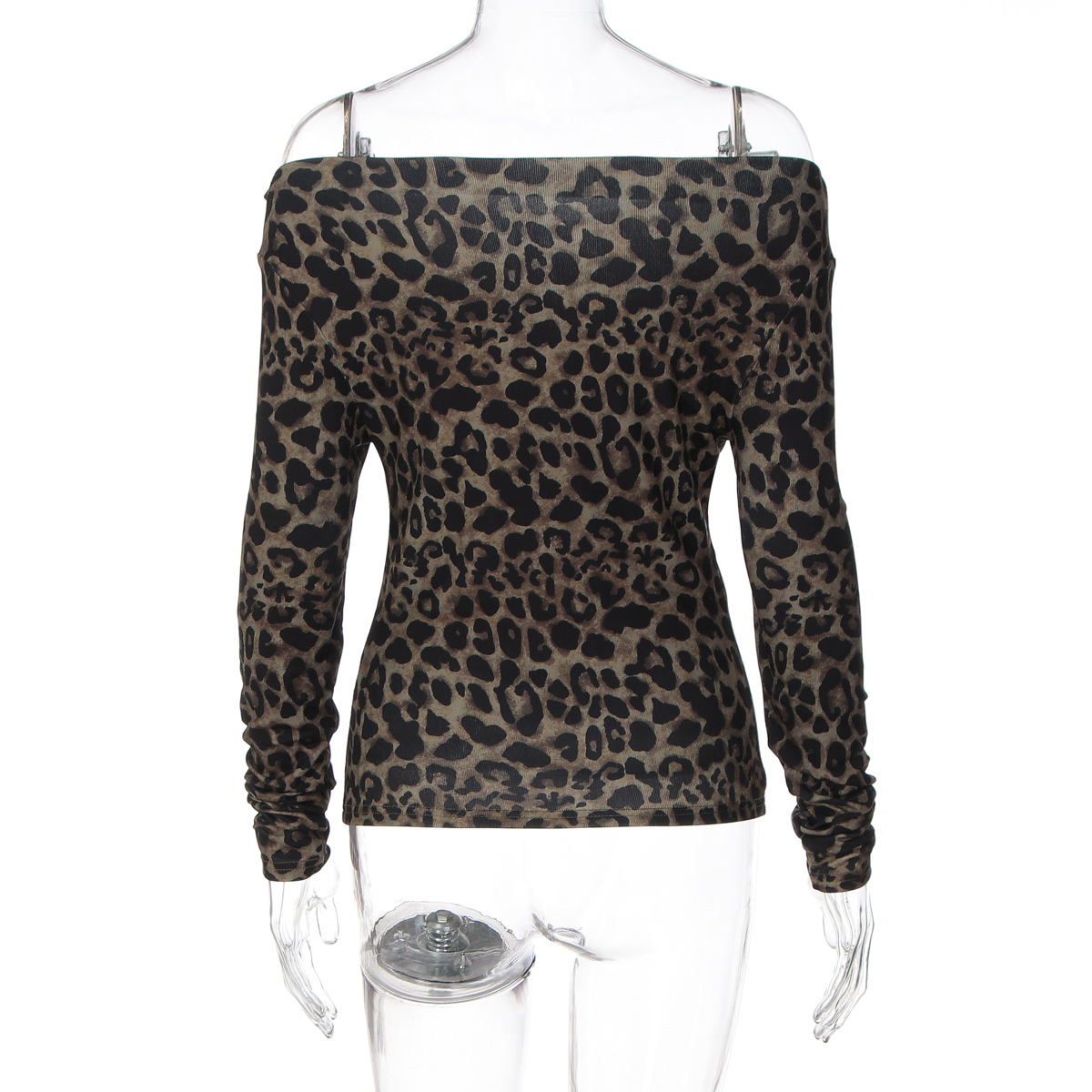 Women Clothing Fall Sexy off Shoulder Leopard Print Slim Fit Sexy Long Sleeve Top