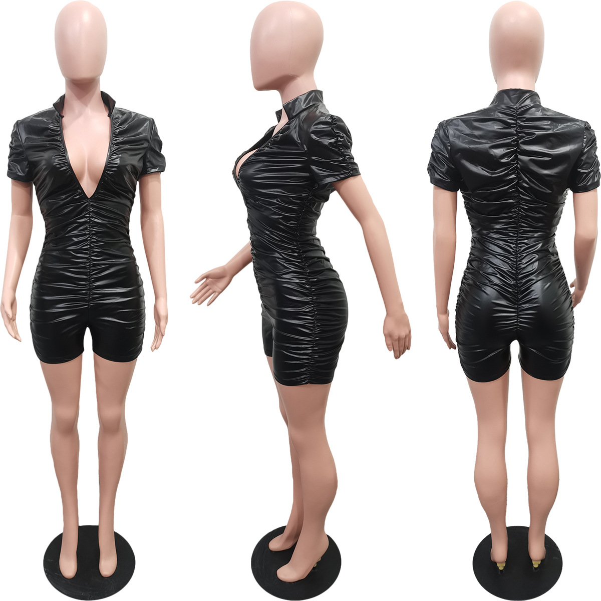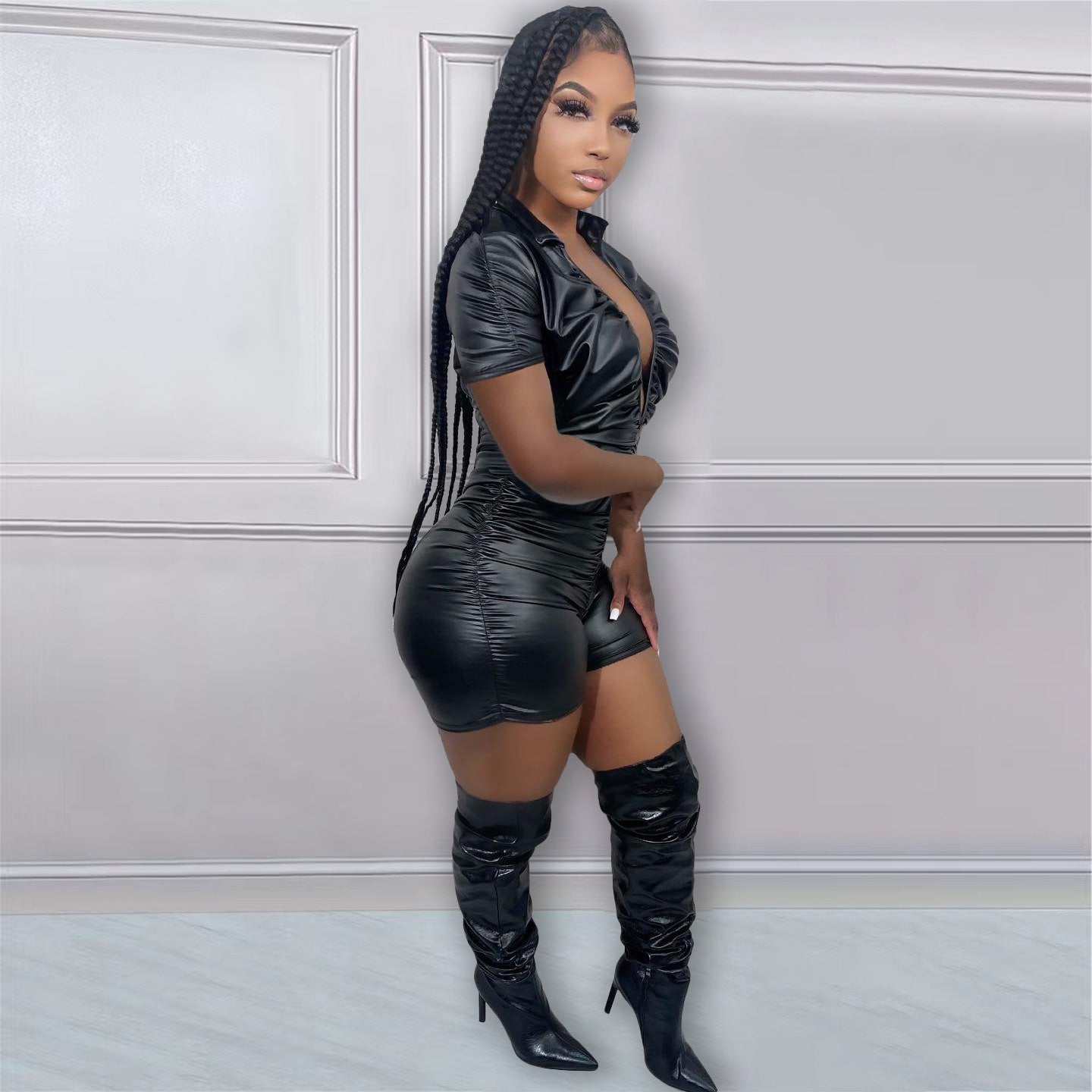 Women Clothing Solid Color Pleated High Elastic Faux Leather Romper
