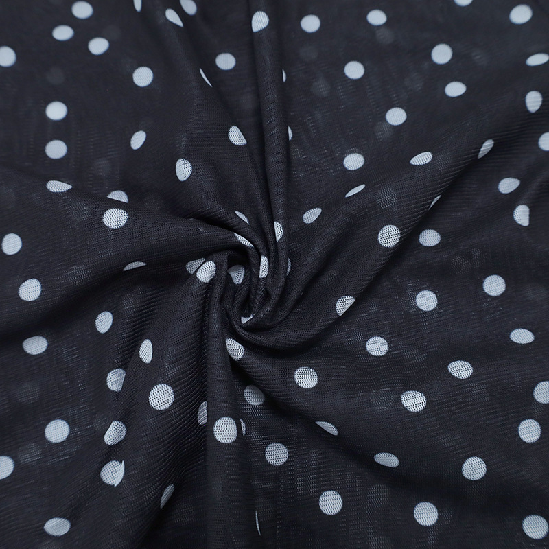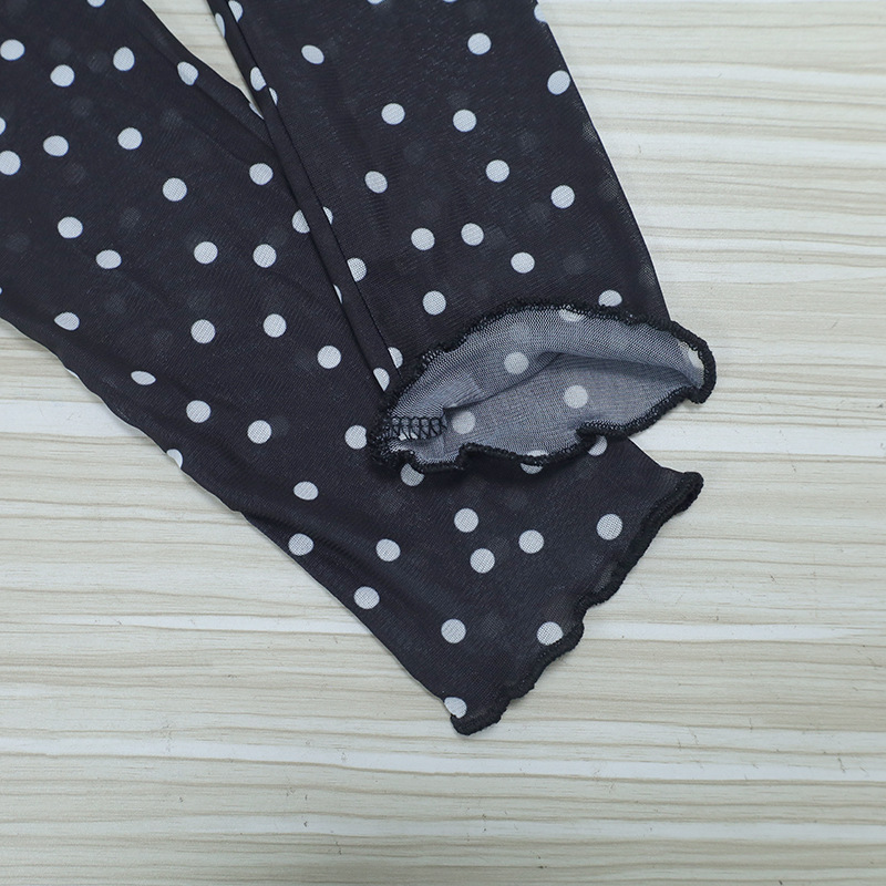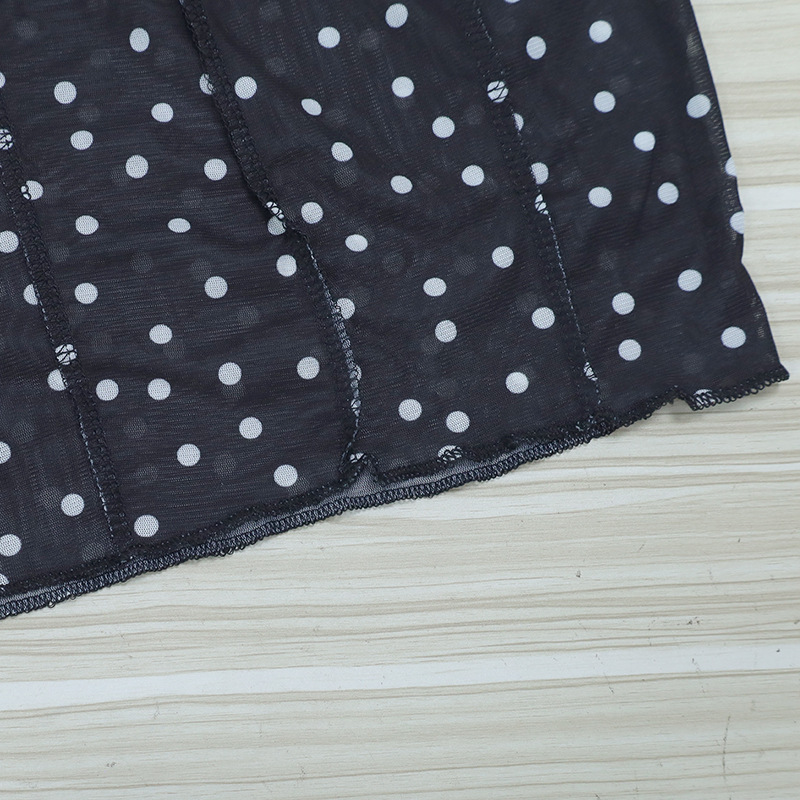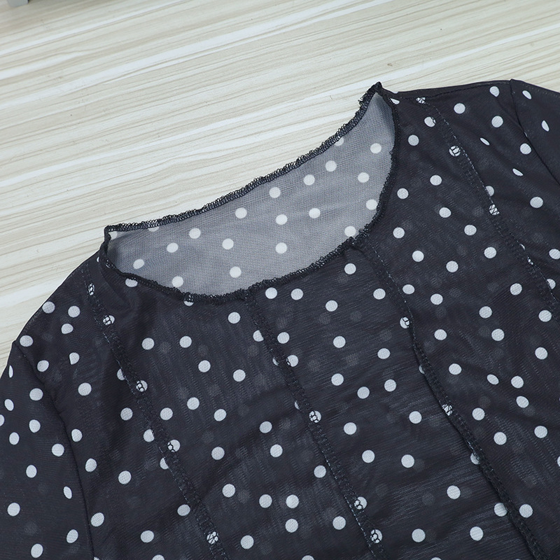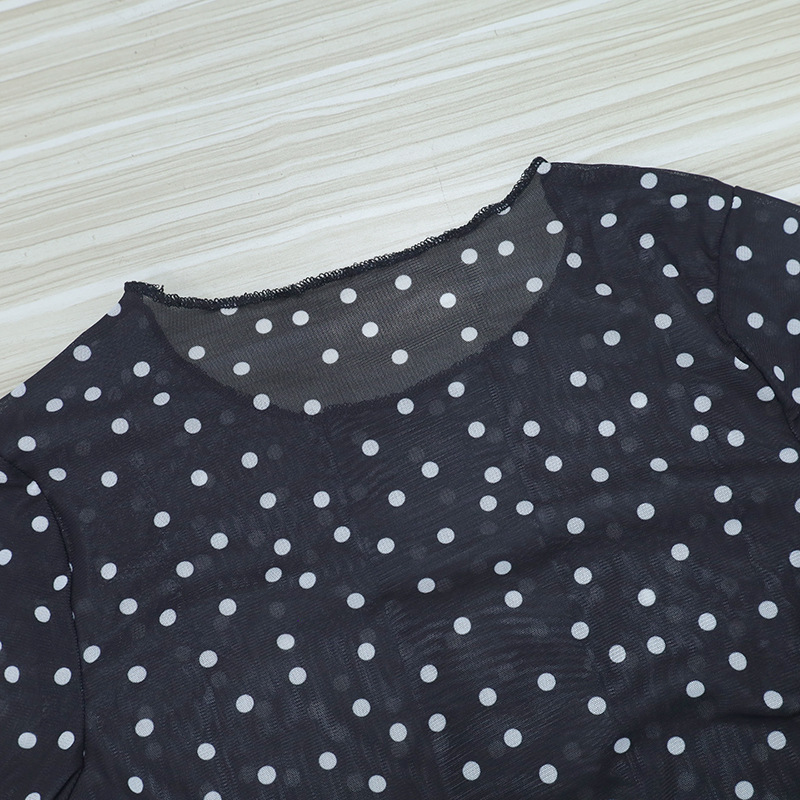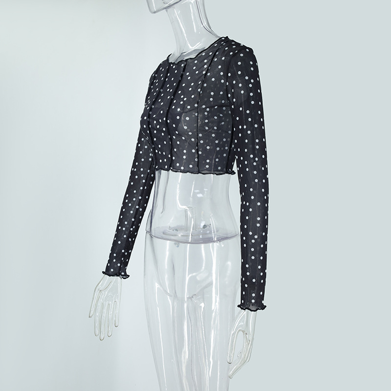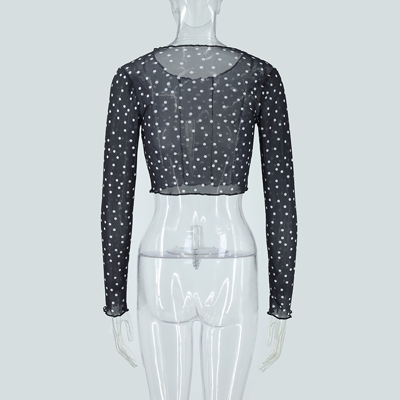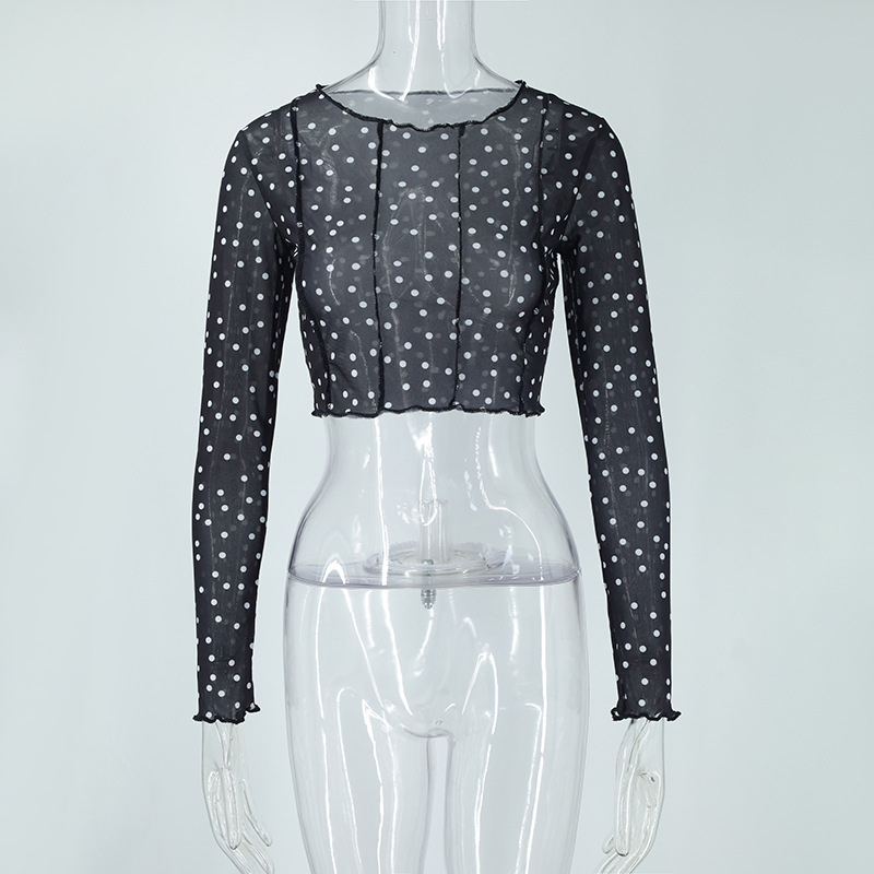Women Clothing Summer round Neck Long Sleeves Cropped Polka Dot Print See-through Mesh Tops Women Hair