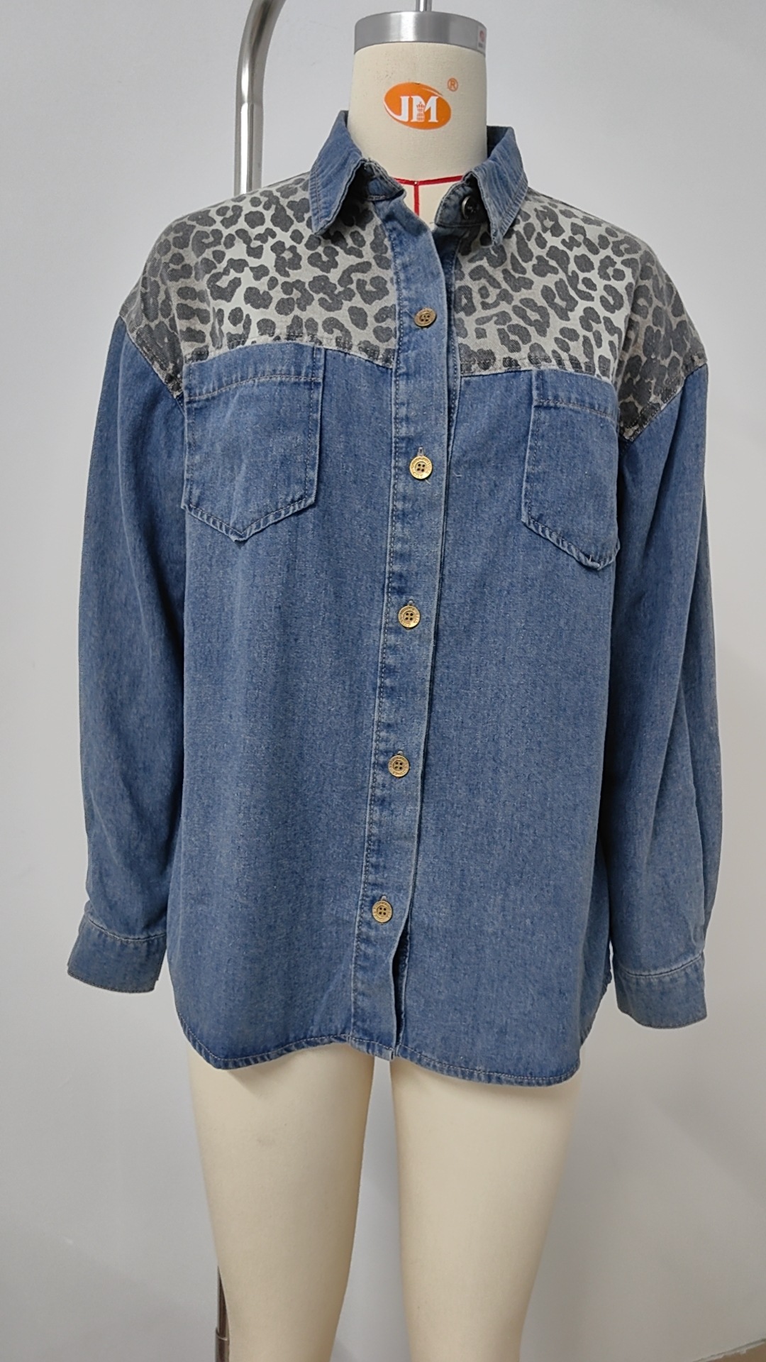 Women Clothing Washed Loose Leopard Print Color Block Denim Shirt Top