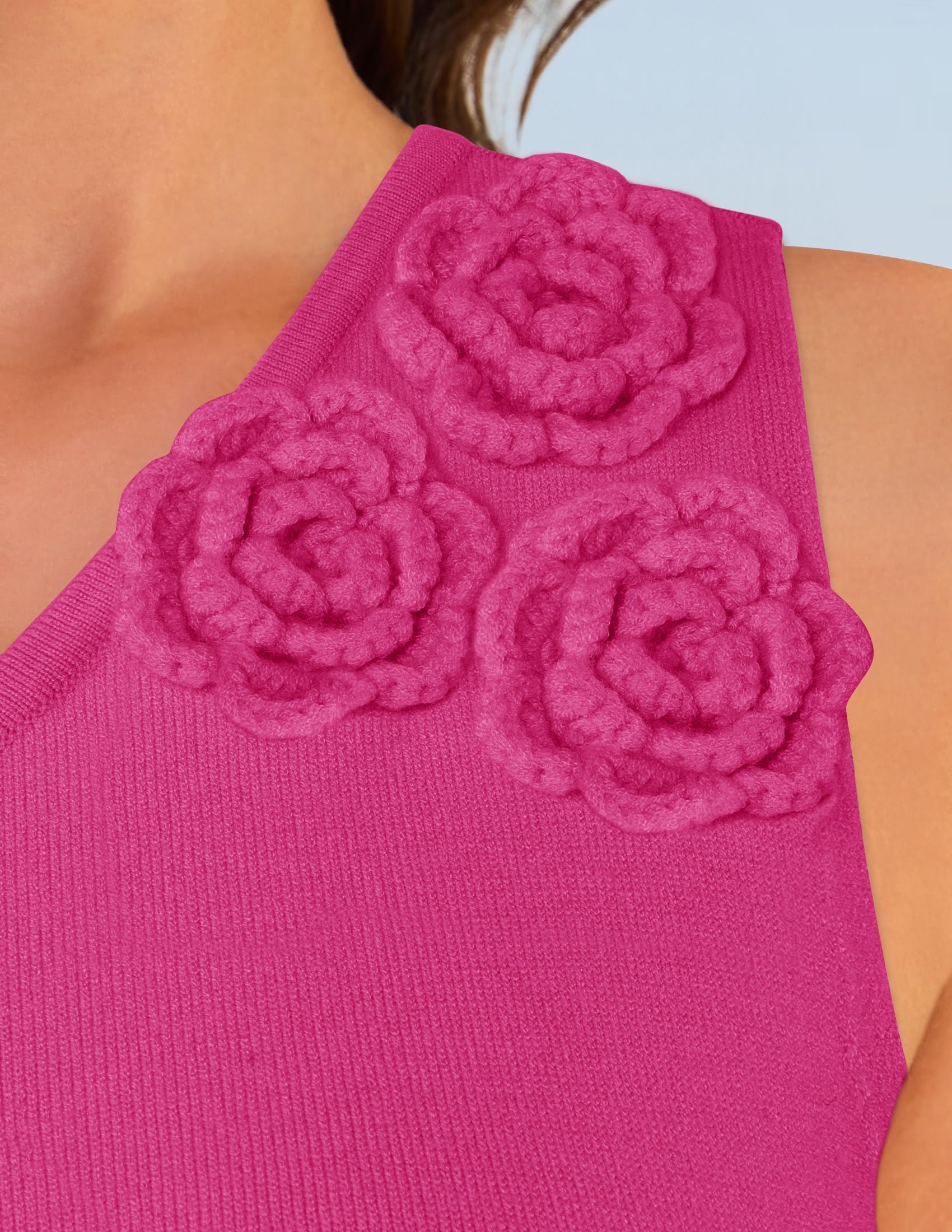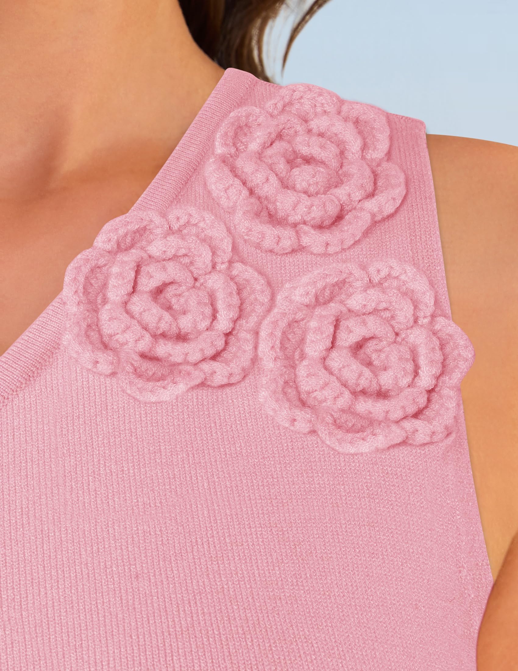- Floral Knit Details - Three decorative knit flowers at shoulder and waist