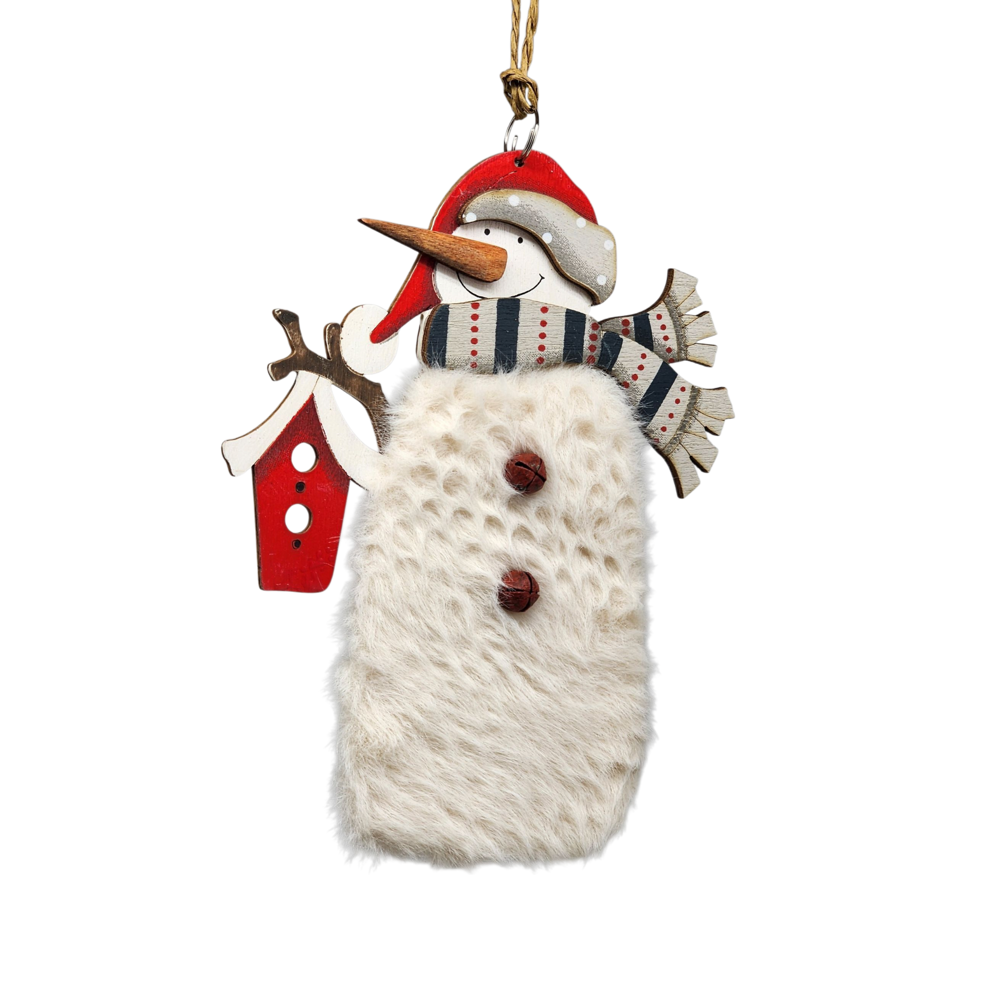Wood and Fur Snowman Ornament - Holding Birdhouse