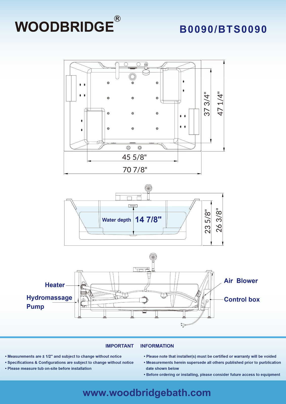 ? [CERTIFICATION & WARRANTY]: WOODBRIDGE Hydromassage bathtub is certified to UL1795. Complies with ASME A112.19.7/CSA B45.10, CSA B45.5/IAPMO Z124, CSA C22.2 No.218. IPC and NPC; Products approved and meet the Massachusetts Plumbing & Gas Code. WOODBRIDGE bathtub is warranted to be free of defects in material and workmanship for 1-Year from date of purchase, The professional support team is happy to assist with any sales or product-oriented queries.
