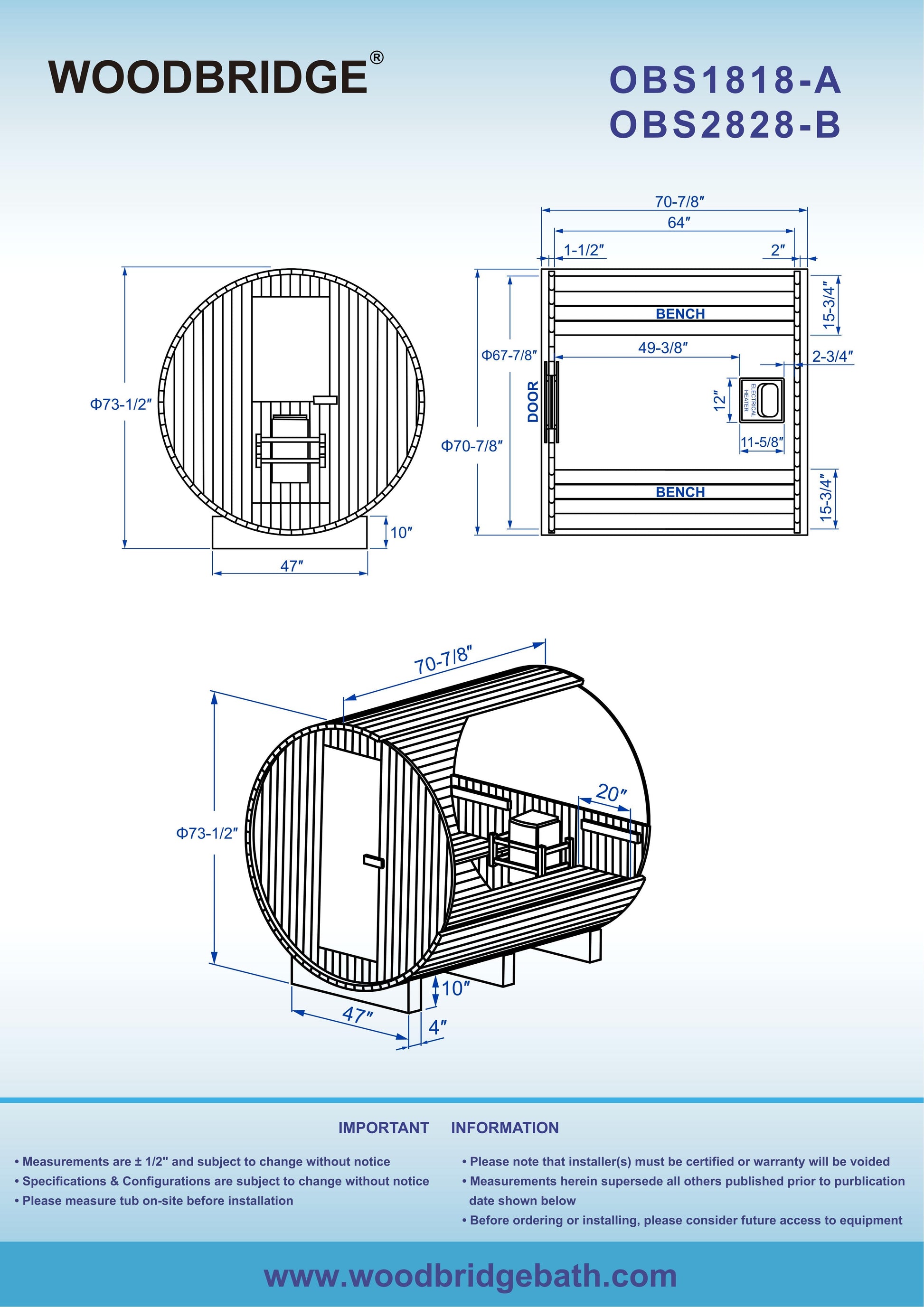 [DIMENSIONS AND SPECIFICATIONS]: Barrel exterior dimension: 47-1/4" (L) x 70-7/8 (W) x 70-7/8" (H). Base cradle dimension: 47" (L) x 4” (D), Room capacity: 2-3 persons